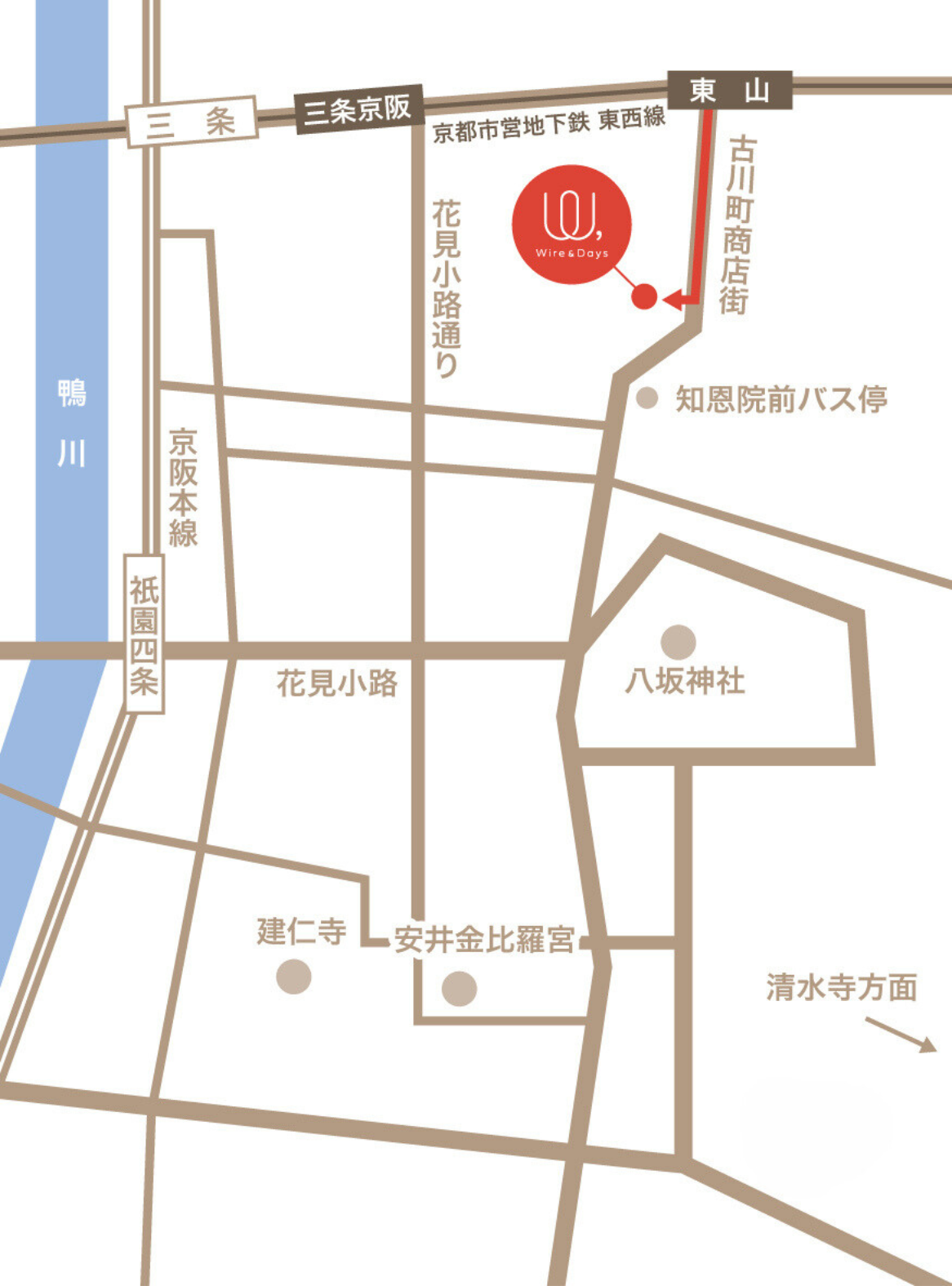 【Wire & Days -ワイヤーアンドデイズ-】の新店舗は、2023年5月10日(水)に、地下鉄東西線「東山」駅直結の古川町商店街にオープンします。古川町商店街は、祇園の八坂神社や知恩院といった観光名所からも近く、日用雑貨店、青果店、ゲストハウスなどが並ぶ昭和レトロな雰囲気の商店街です。カラフルなランタンが飾られたアーケードは、観光客にとって新たな映えスポットとして注目を集めています。