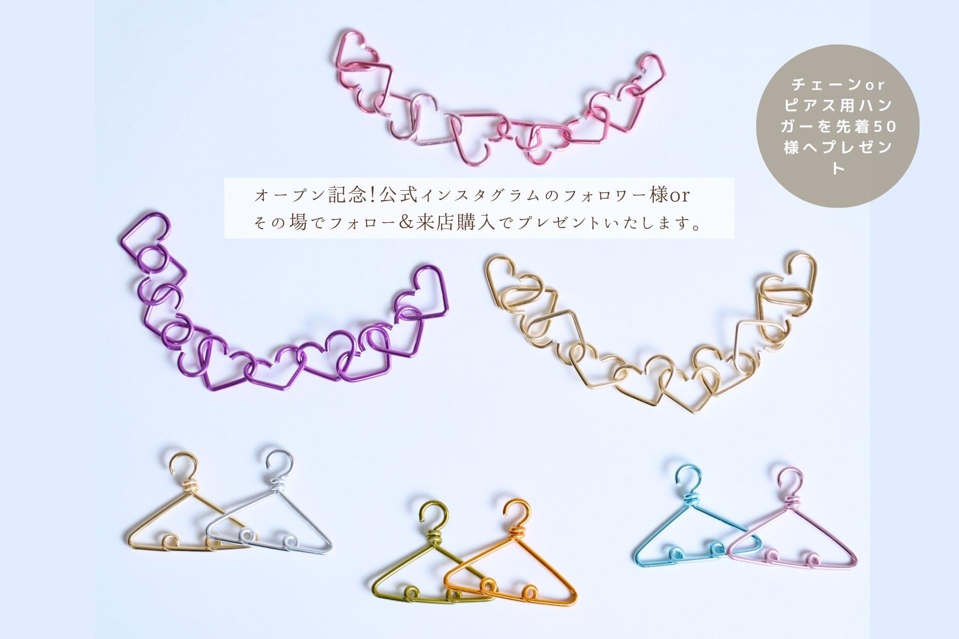 グランドオープンに伴い、5月10日(水)~5月14日(日)に店舗へご来店いただき、ご購入&公式Instagramフォロー(現状フォローしていただいている方も該当)で先着各50名の方へ「(ハート型)チェーン10個セット」or「ハンガーラック2個」をプレゼントさせていただきます。