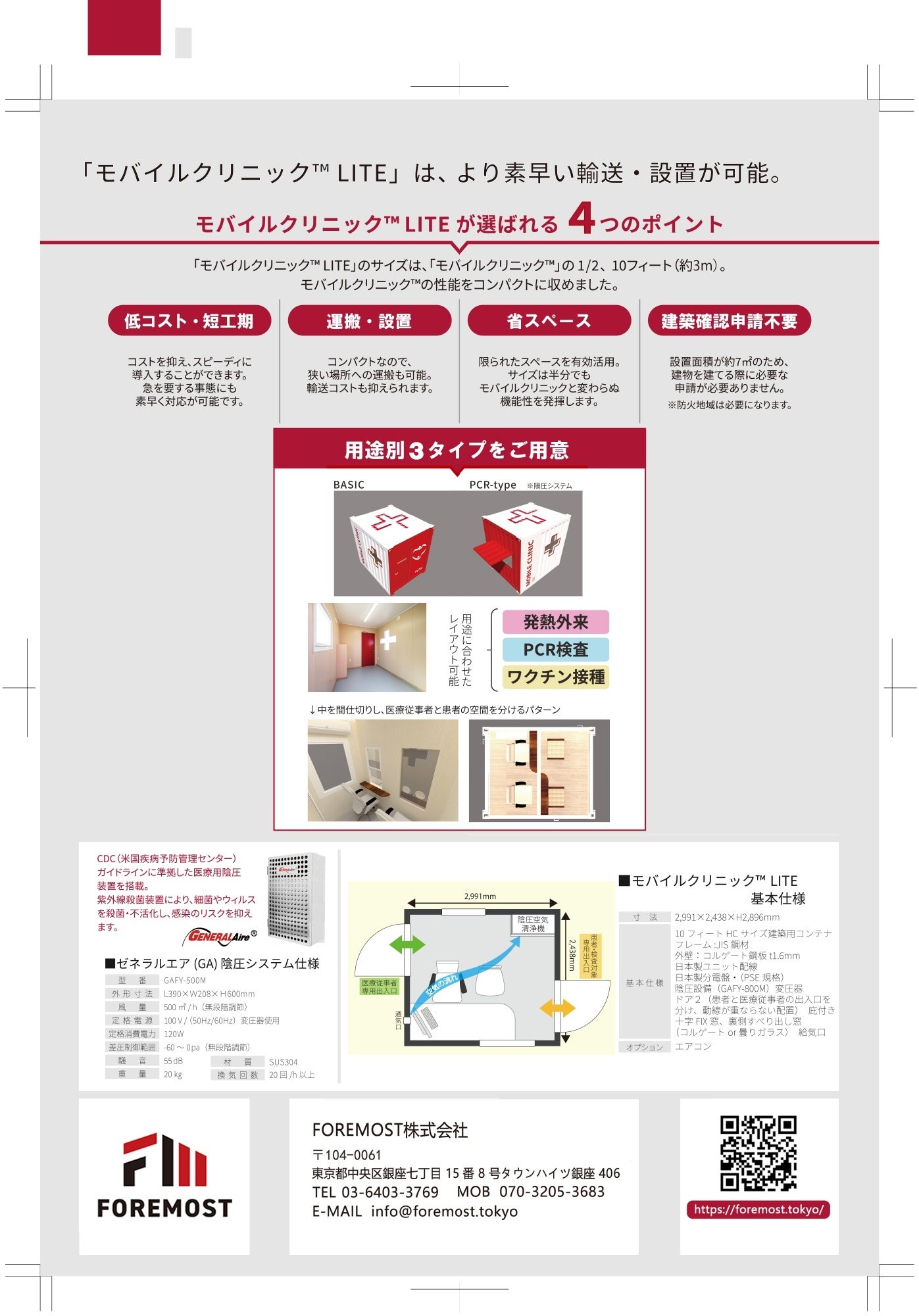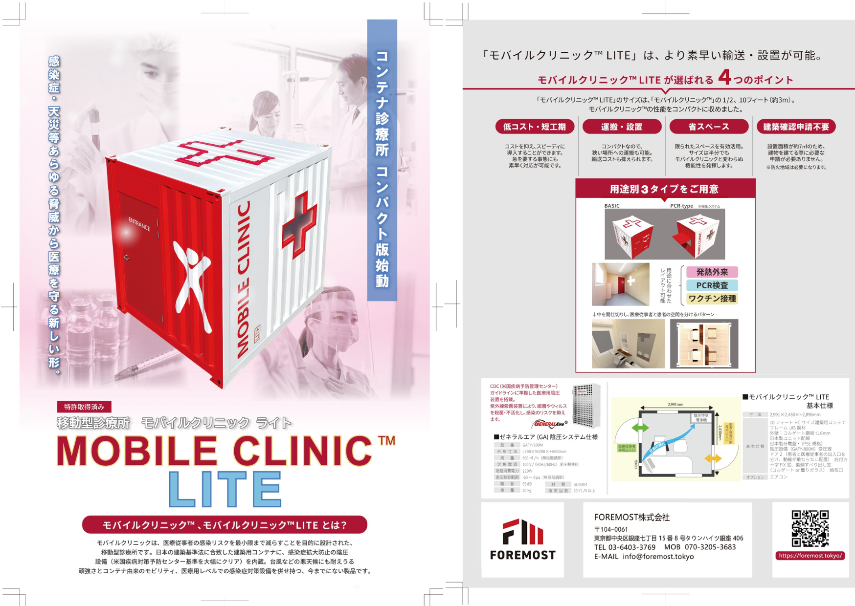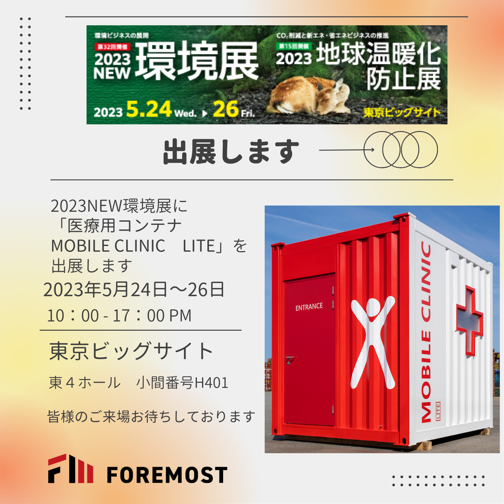 FOREMOST株式会社(フォーモスト株式会社)は2023年5月24日から26日にかけて、東京ビッグサイトで開催される2023NEW環境展に、医療用コンテナMOBILE CLINIC LITEを出展いたします。