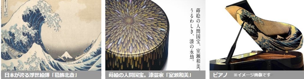 日本を代表する絵師であり、フランス印象派に多大なる影響を与えた葛飾北斎の研究機関である、国際北斎学会/一般社団法人日本美術アカデミー代表理事の遠藤欽久氏、漆芸家であり、重要無形文化財「蒔絵」の保持者である人間国宝の室瀬和美氏、現代日本画家の大竹寛子氏らが、遠州ピアノとコラボしたプログラムを予定しています。遠州ピアノは、静岡県にある遠州楽器制作株式会社が製造するピアノで、日本国内はもちろん、世界中から高い評価を得ています。異なる芸術分野のアーティストたちが交流することで、日本の新しい文化を発信します。