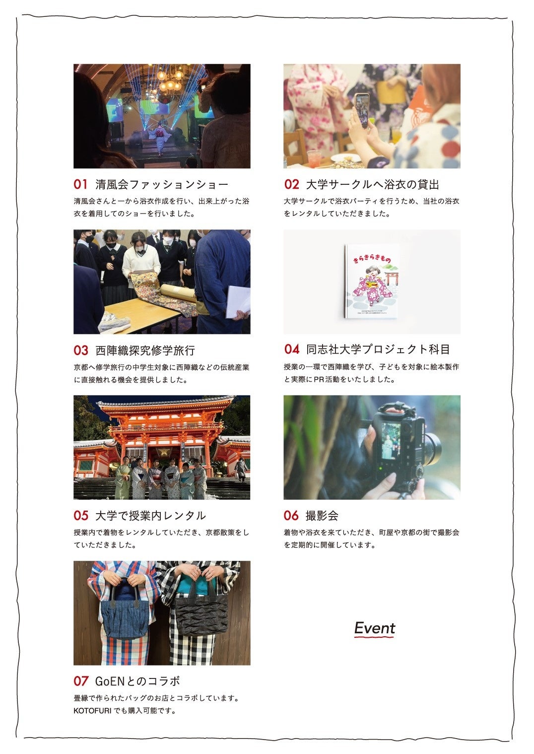 “若者と共に振袖業界を盛り上げたい”という《KOTOFURI PROJECT》の掲げる願いに向かい、若者に伝統産業である和装文化を広めるため、事業の一環として京都の学生団体と協力し2022年3月発刊のフリーペーパーにタイアップ記事を掲載しています。