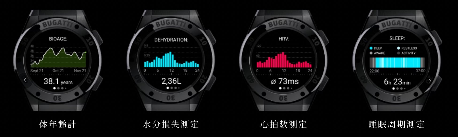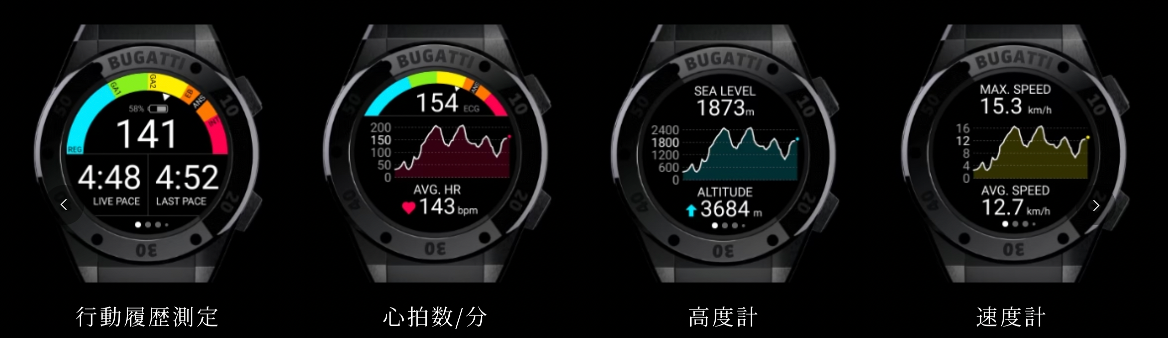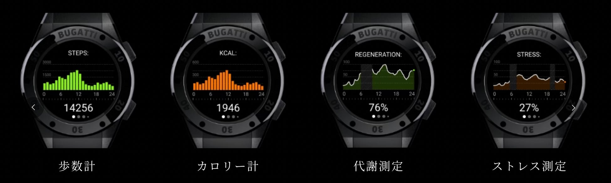 健康管理に強いこだわりがあり、生体健康管理が出来るスマートウォッチの中でも初めてデュアル心拍センサー(心拍数を正確に測る2つのセンサーを内臓)を採用。これにより高精度な健康管理が可能となりました。代謝測定、体年齢計、ストレス測定、水分損失測定、心拍数など健康機能を正確に測るために、1秒に10回追跡するGPSセンサー機能を搭載。この健康管理機能を実現するためにバッテリーの寿命も格段に向上。アップルのスマートウォッチの場合は1日から3日に対して、ブガッティのスマートウォッチの今作モデルは7日から15日と、バッテリー寿命が約5倍になりました。