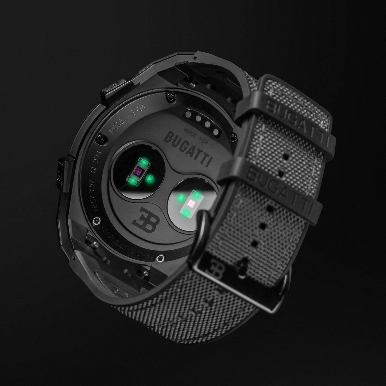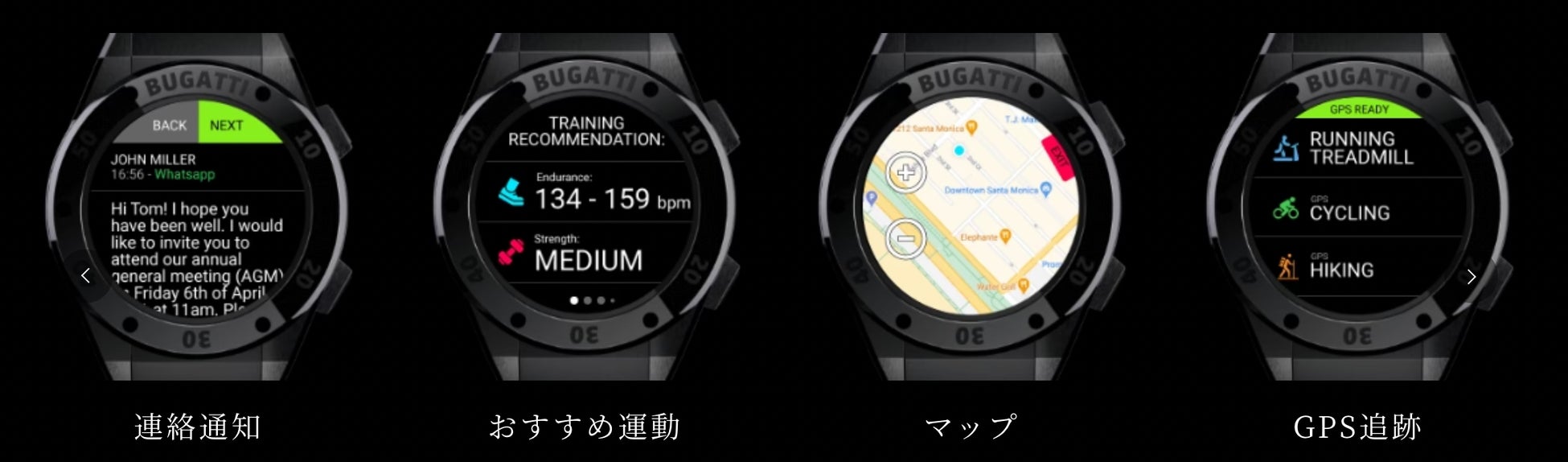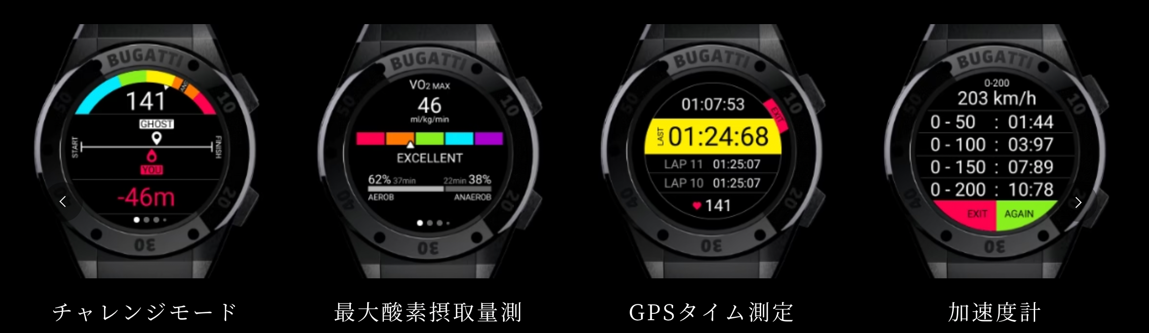 健康管理に強いこだわりがあり、生体健康管理が出来るスマートウォッチの中でも初めてデュアル心拍センサー(心拍数を正確に測る2つのセンサーを内臓)を採用。これにより高精度な健康管理が可能となりました。代謝測定、体年齢計、ストレス測定、水分損失測定、心拍数など健康機能を正確に測るために、1秒に10回追跡するGPSセンサー機能を搭載。この健康管理機能を実現するためにバッテリーの寿命も格段に向上。アップルのスマートウォッチの場合は1日から3日に対して、ブガッティのスマートウォッチの今作モデルは7日から15日と、バッテリー寿命が約5倍になりました。