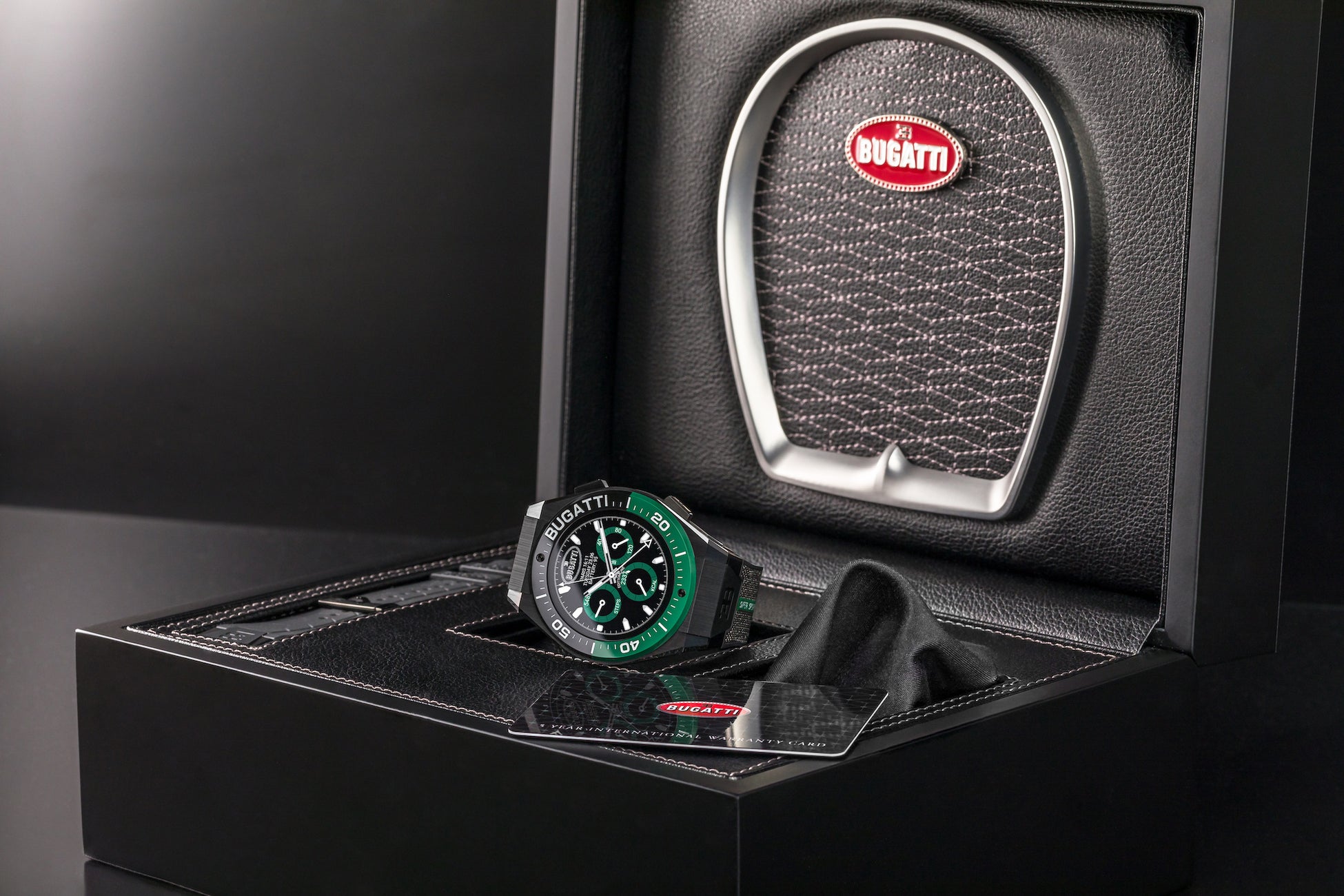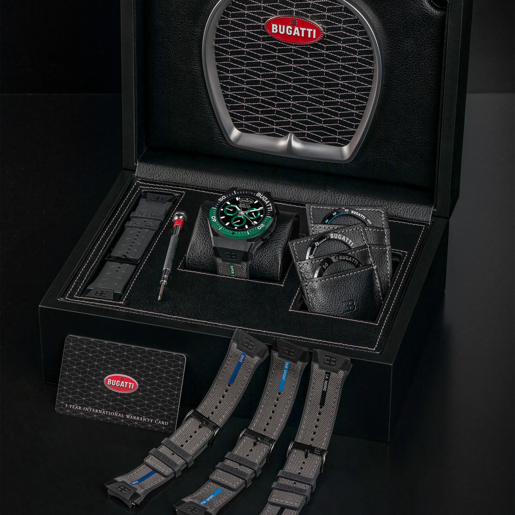 3作目にあたる『BUGATTI CERAMIQUE TITANE EDITION』 (ブガッティセラミックチタンエディション)は、取り替え専用ベゼルが4つと、取り替えベルトが5本付いたフルセットモデルであり、重厚なウッドボックスに包装され、高級感溢れる製品に仕上がっています。