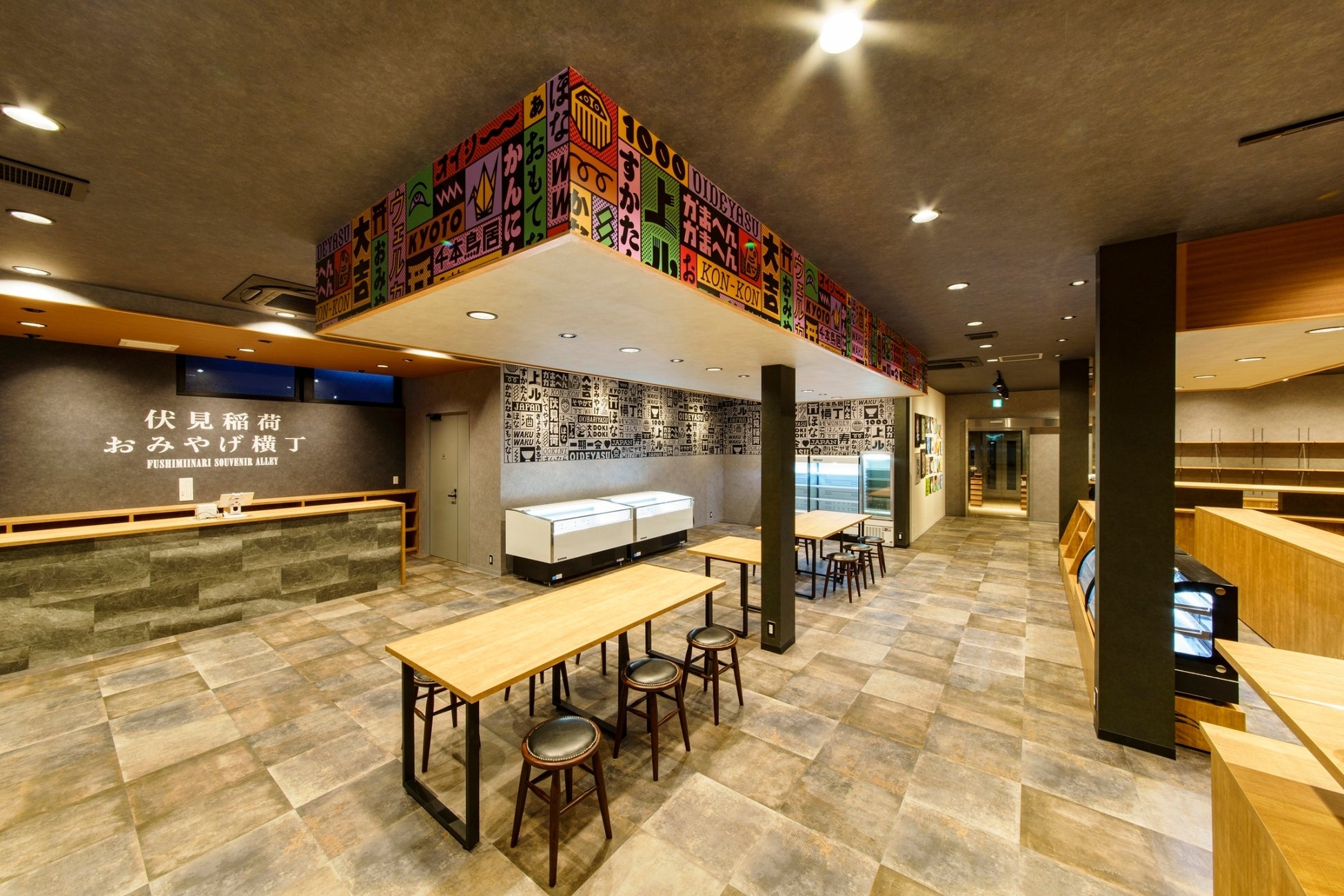 2階には【伏見稲荷おみやげ横丁】として約90に区切られた各スペースを、出店者がアレンジをし伏見稲荷を拠点に世界発信をしていくおみやげ売場。お菓子・雑貨・アパレル・コスメ・アート作品など様々な商品が揃う展示会型のお土産ショップになります。