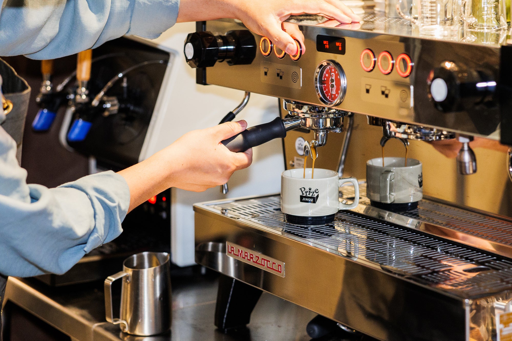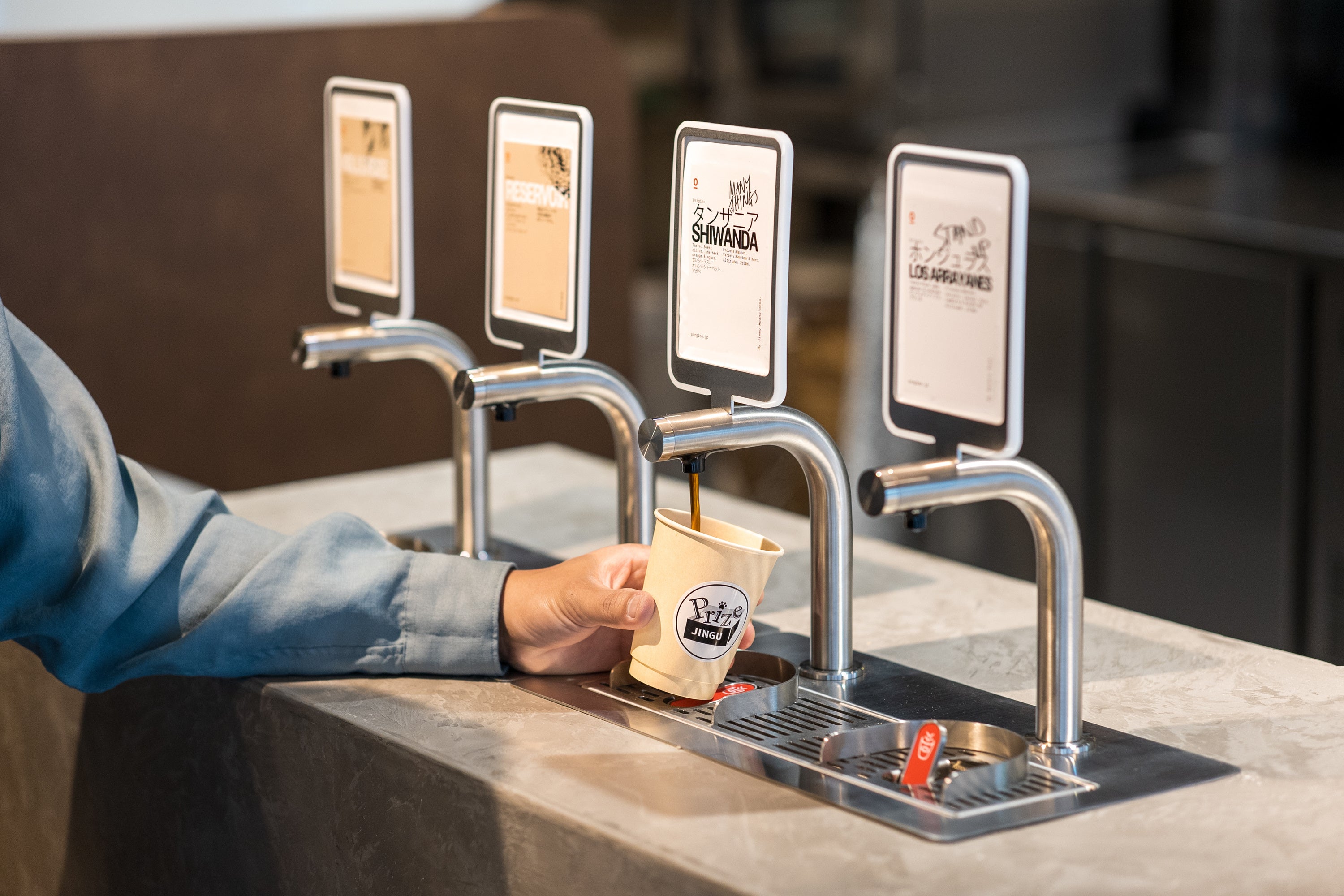 都内でもめずらしいタップコーヒーを採用、キャッシュオンでカップを渡されたら10秒で片手で注げます。