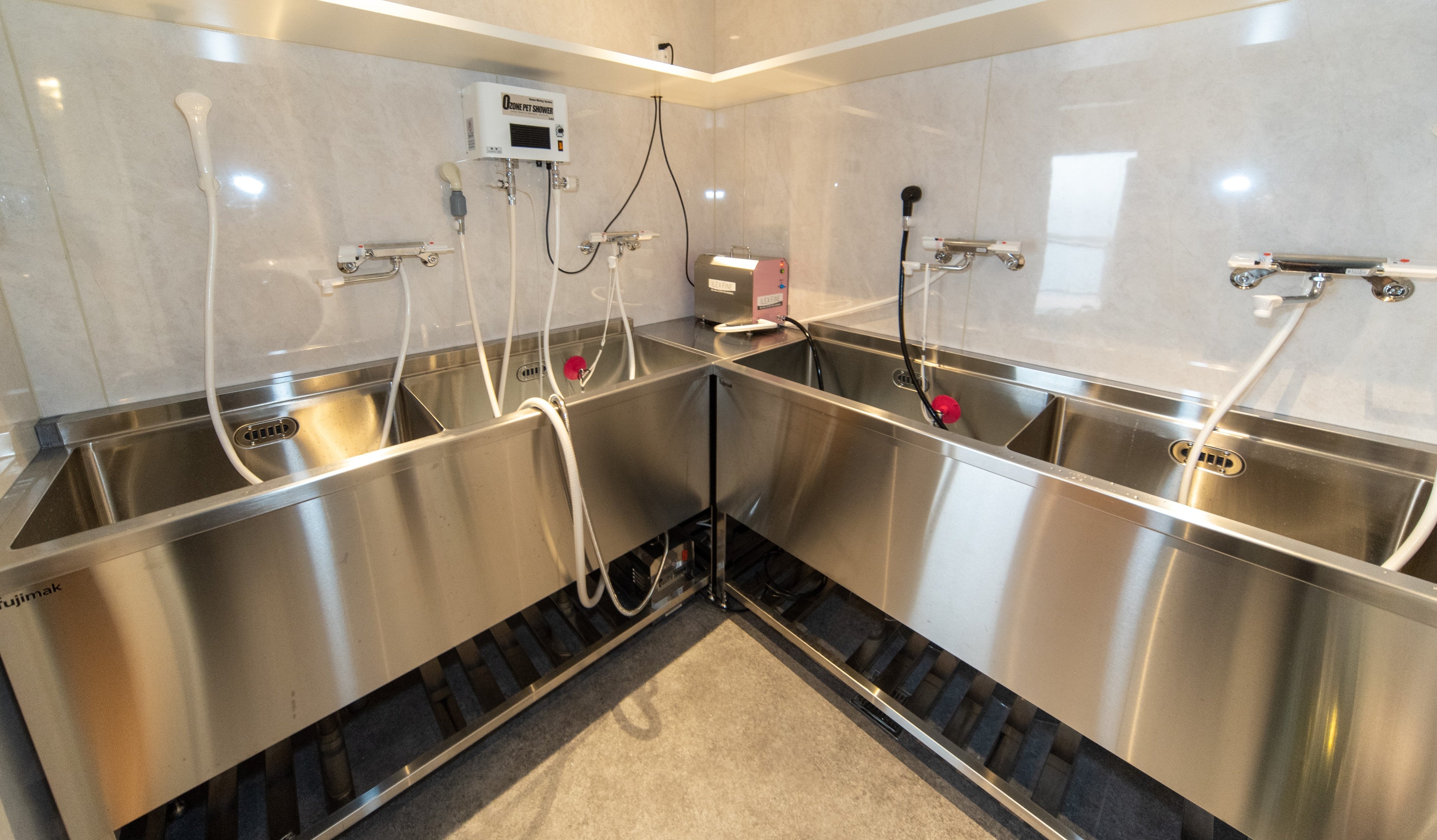 同ビルに併設する動物病院の皮膚科専門医と連携し、皮膚科医推奨の薬浴等を推奨しています。医療の目線で獣医師からアドバイスを仰ぎ、ペットの皮膚や毛を健康にするためのオゾンペットシャワー、ウルトラファインバブル、炭酸泉などILEX社のクワトロシステムによる4つの機能を用いて脂漏やシャンプー残りをなくします。