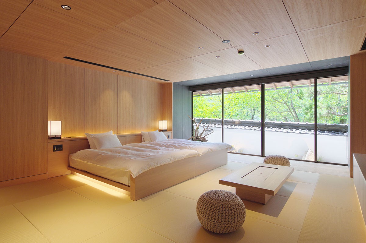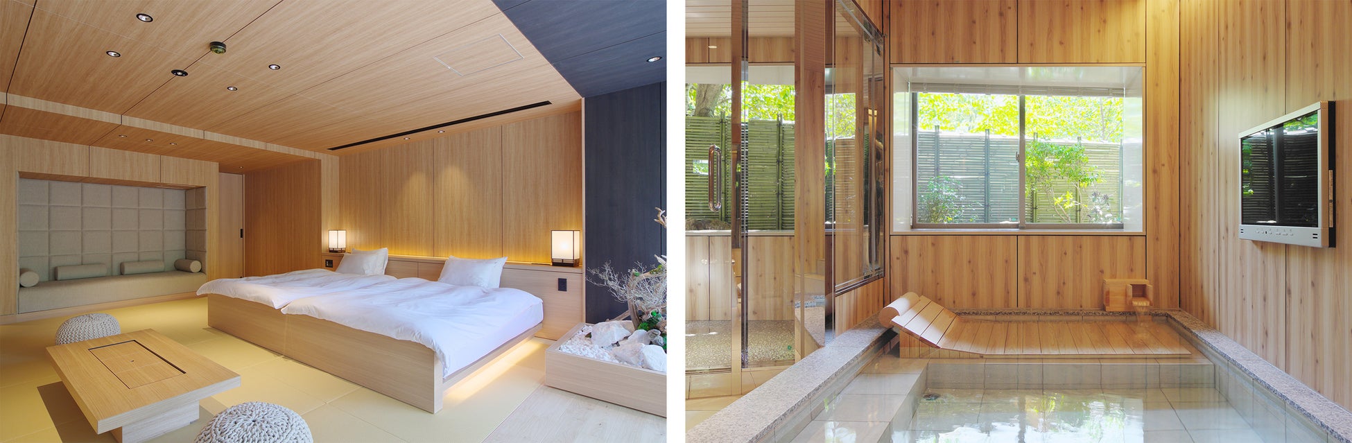 客室内に大浴場・半露天の壺風呂・ミストサウナを備え、内装やインテリアはウェルネス&ビューティのプロが監修。 記念日の滞在や大切な方のおもてなしにも最適なスイート仕様の客室です。