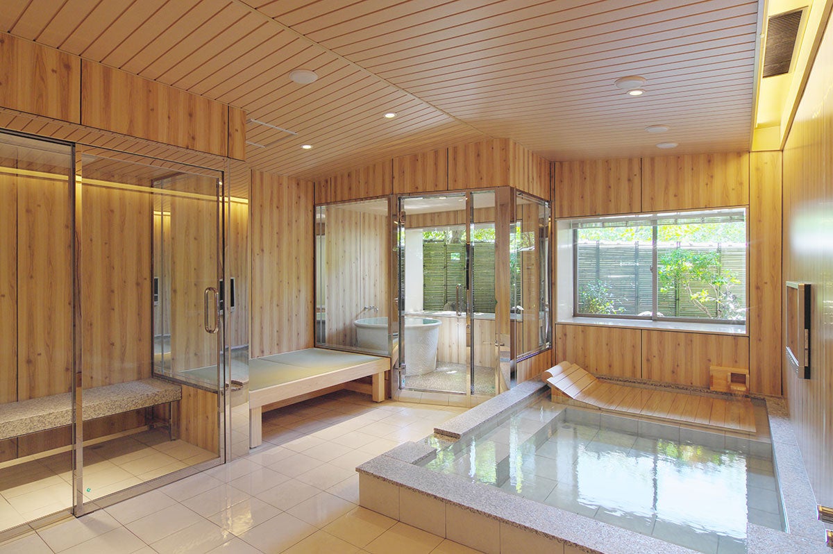 スパエリア「ゆ処」には、家族で楽しむことのできる大浴場と半露天の壺風呂を設置。寝湯やテレビを備えた大浴場でゆっくりとお寛ぎいただけるのはもちろん、こだわりの壺風呂では借景庭園を眺めながらのご入浴もご堪能いただけます。