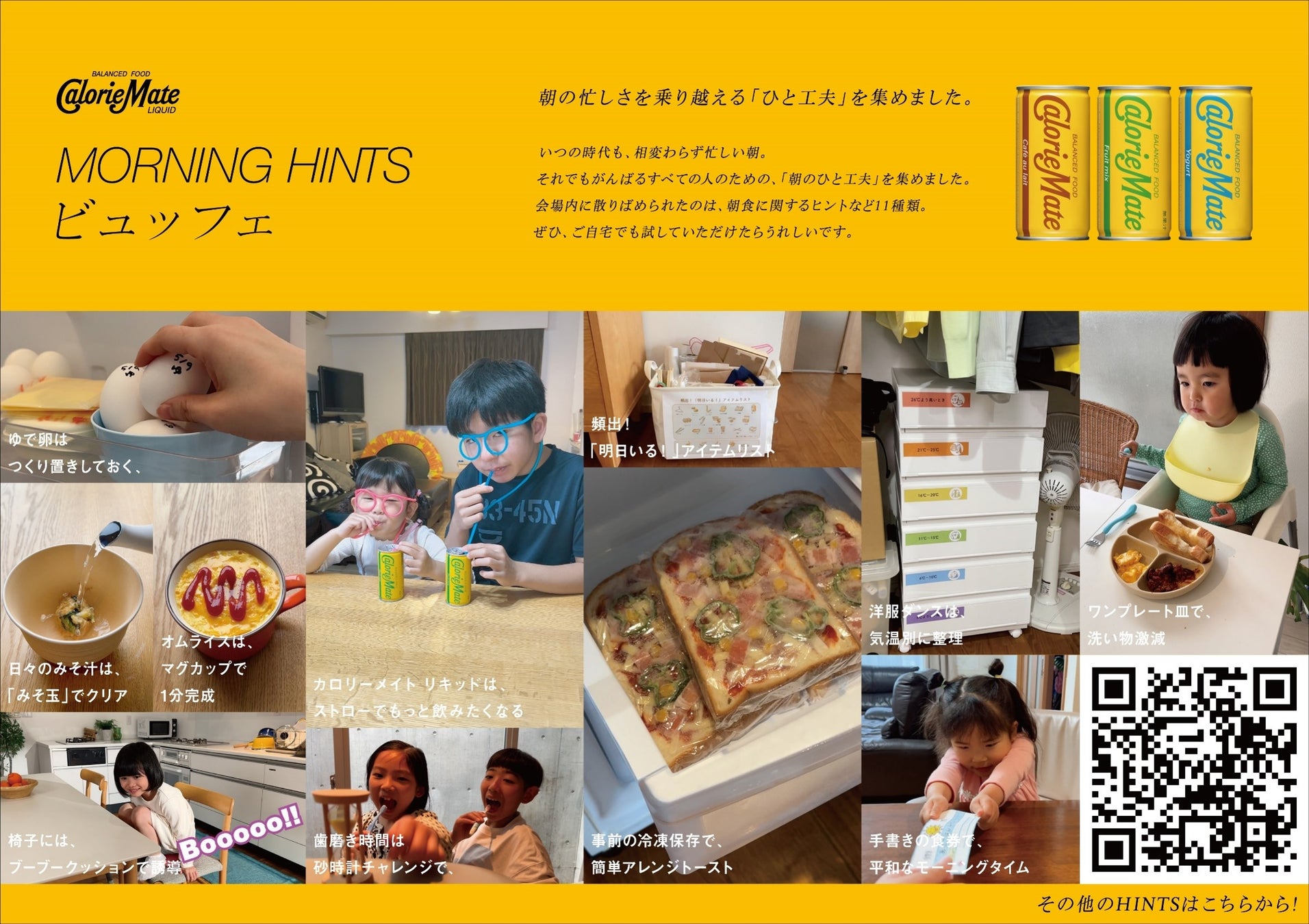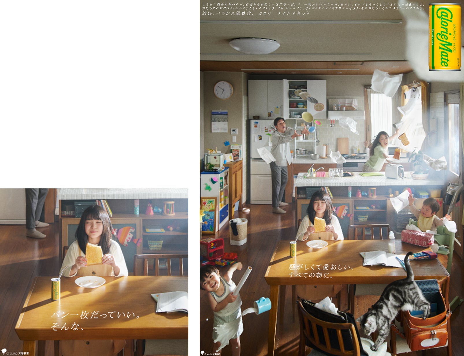 カロリーメイト リキッドが朝のバタバタをひと工夫で“すこし楽にする”「MORNING HINTS」を子育て家庭から集めて公開!予期せぬことが多発する忙しい朝の風景を特殊撮影でリアル再現した新聞広告も