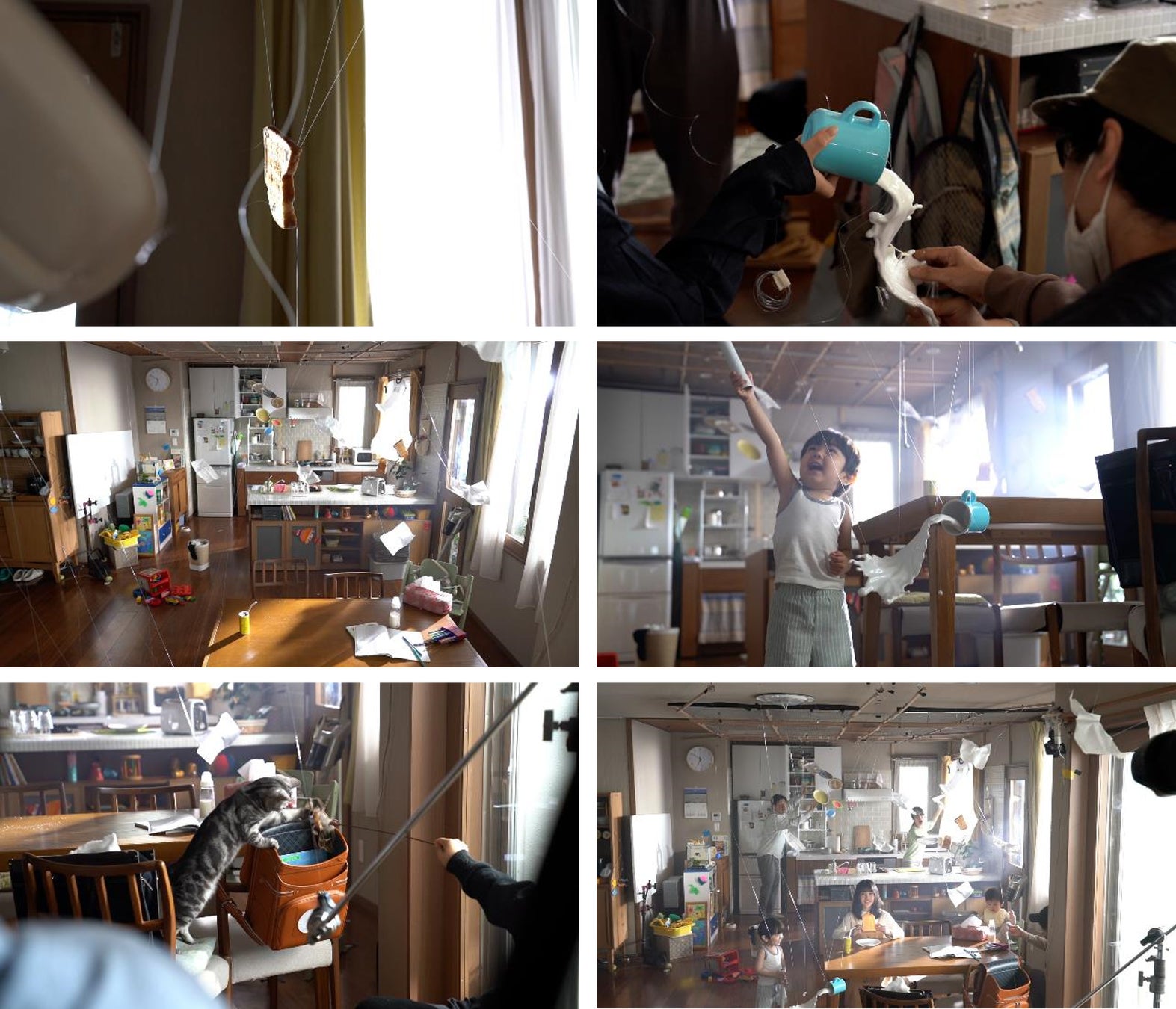 この慌ただしくも幸せな家庭のストーリーに登場するひとつひとつの物(プロップス)たちは、テグスを使って吊り上げ、空中に浮かし撮影されています。この朝の瞬間のファンタジー空間は合成ではなく現実に存在しています。撮影されたビジュアルを見た方から「今日のうちの朝はこんな感じだった」と言う声が聞こえました。もしかしたら、わたしたちの現実世界はファンタジックで驚きにあふれているのかもしれません。