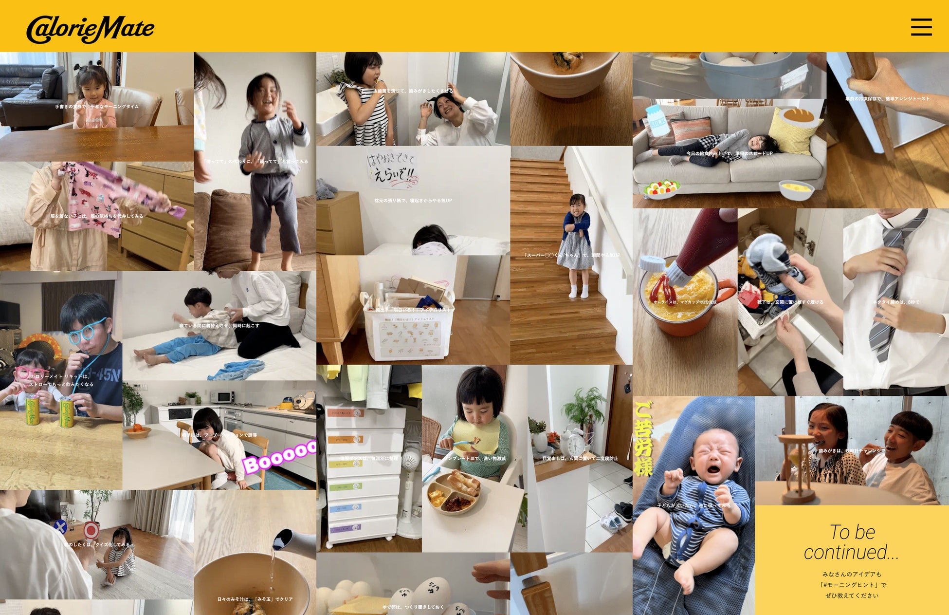 特設サイトでは、朝の忙しさを乗り越える「ひと工夫」を紹介。子どもの支度や食事のお世話、自身の仕事の準備などでバタバタしてしまいがちな朝でも、「子どもにはバランスの良い朝食を食べさせたい」「限りある時間をできるだけ楽しい時間にしたい」といった責任世代の皆様の想いに寄り添うことができる、アイデアが詰まったサイトです。『子どもに「待ってて」の代わりに、「踊ってて」と言ってみる』『頻出!「明日いる!」アイテムリスト』『カロリーメイト リキッドは、ストローでもっと飲みたくなる』など、23種類ものヒントを紹介します。