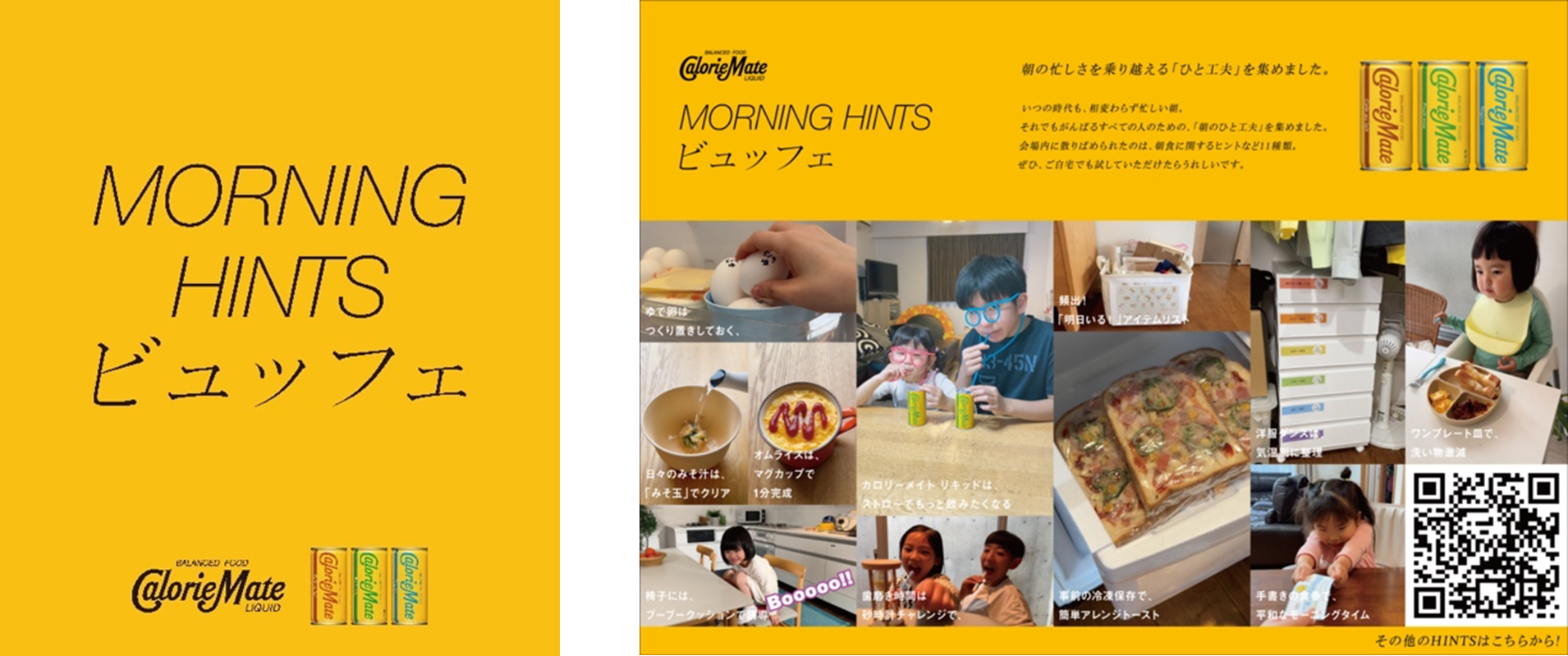 5月19日(金)より3日間、「MORNING HINTS」を活用し、朝のバタバタを少しだけ楽にする学びを持ち帰ることのできる学び型朝食ビュッフェ「MORNING HINTS ビュッフェ」を千駄ヶ谷のGOOD MORNING CAFE NOWADAYSにて開催します。特に忙しい朝になりがちな、小学生の子どもがいるご家庭が参加できるこのビュッフェでは、忙しい朝に役立つ「MORNING HINTS」の中から、朝食に関するヒントなど11種類を会場内に散りばめ、実際に体験できるようになっております。ご参加されたご家族には、子どもと楽しく過ごすためのアイテムの一部やカロリーメイト リキッドのなどをお持ち帰りいただけます。