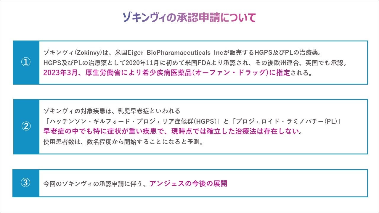 アンジェス株式会社(大阪府茨木市、代表取締役社長:山田 英。以下、当社)は、乳児早老症であるハッチンソン・ギルフォード・プロジェリア症候群とプロセシング不全性のプロジェロイド・ラミノパチーの治療剤である「ゾキンヴィ」(一般名:ロナファルニブ)について、本日、厚生労働省に国内製造販売承認申請を行いましたのでお知らせいたします。