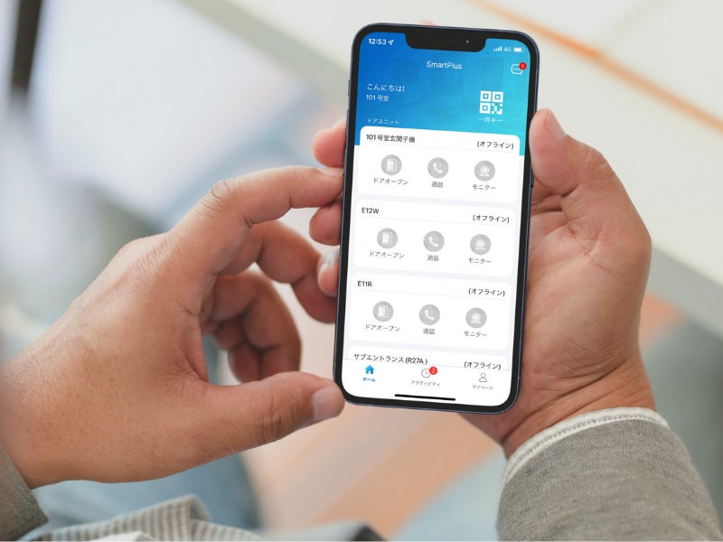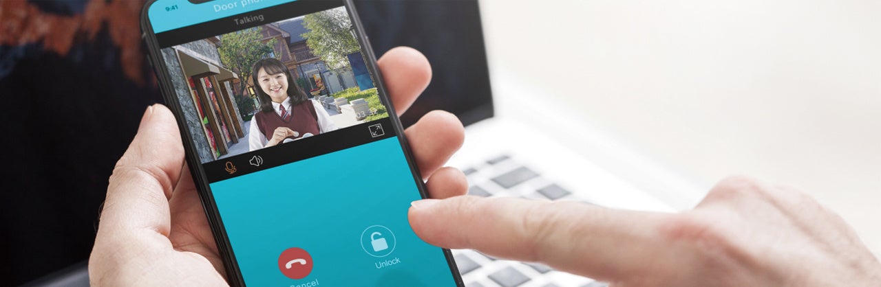 呼出対応は宅内のモニターからではなくスマートフォンアプリからも対応可能。リビングでくつろいでいるときやデスクワーク中、ショッピング中でも、簡単に来客対応ができます。