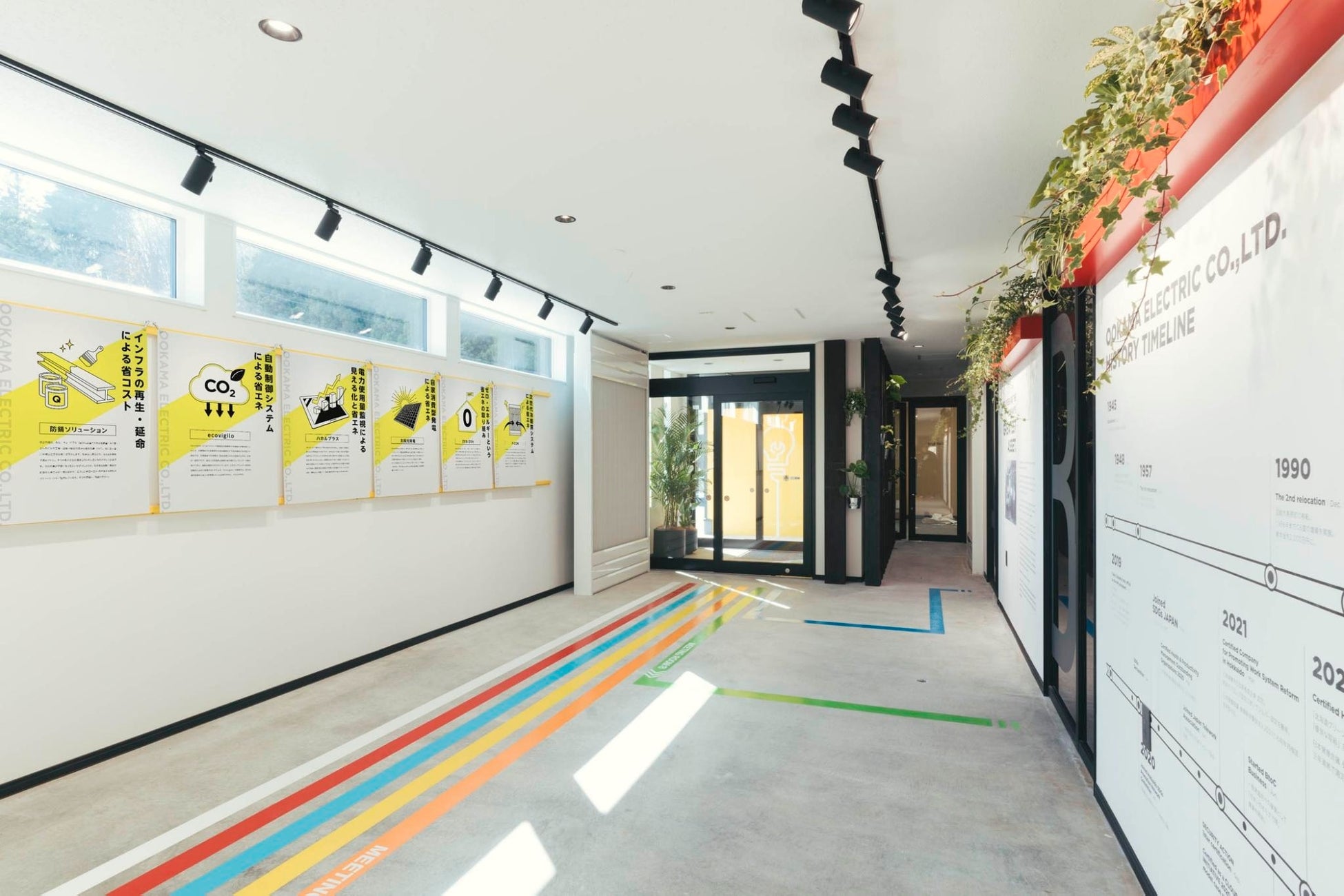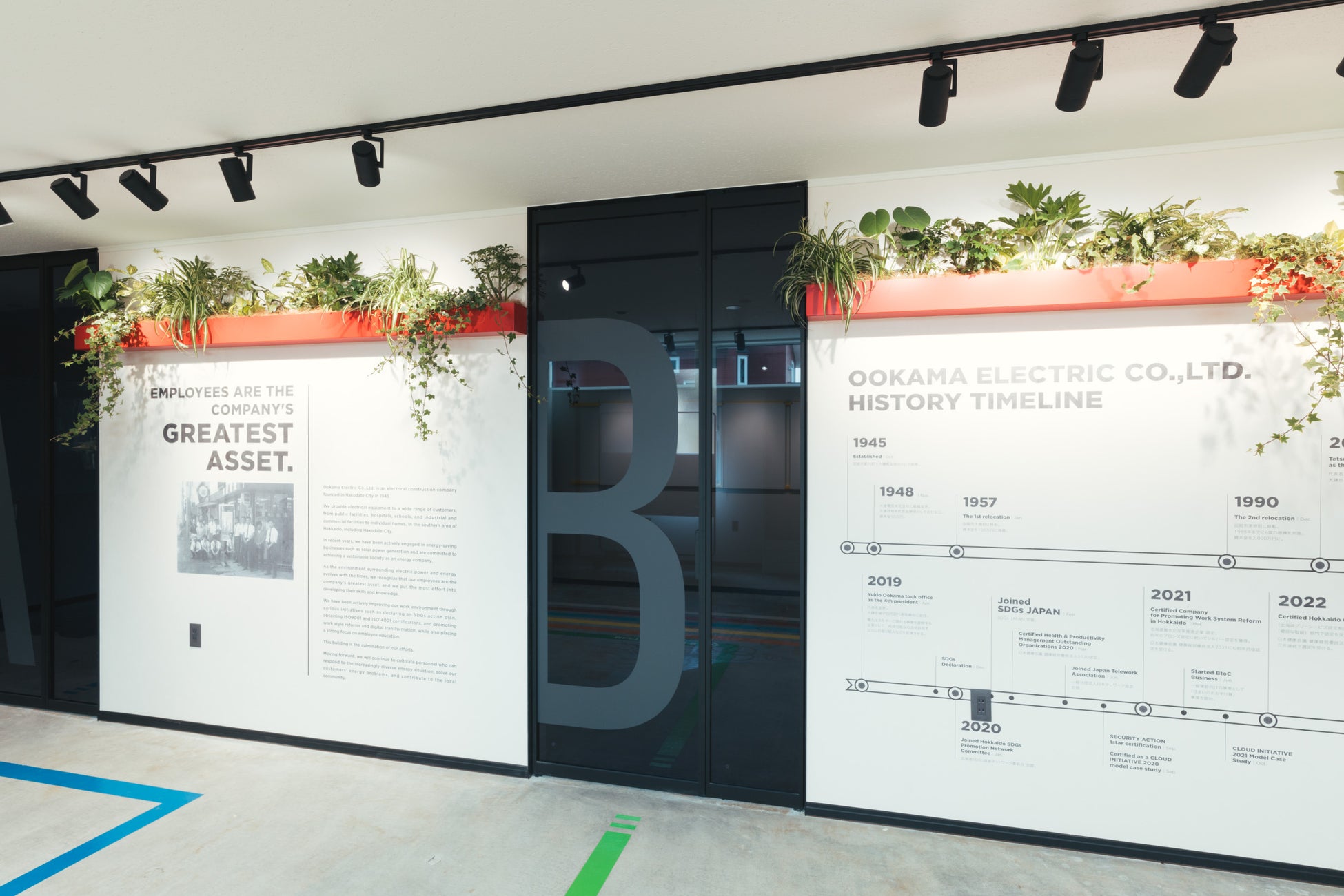 研修室の前には創業まもなく80年を迎える大鎌電気株式会社の歴史、そしてISO9001 / ISO14001の取得やSDGs宣言、働き方改革やDX化など持続可能な社会の実現を目指す私たちの取り組みをヒストリーウォール形式で展示しています。