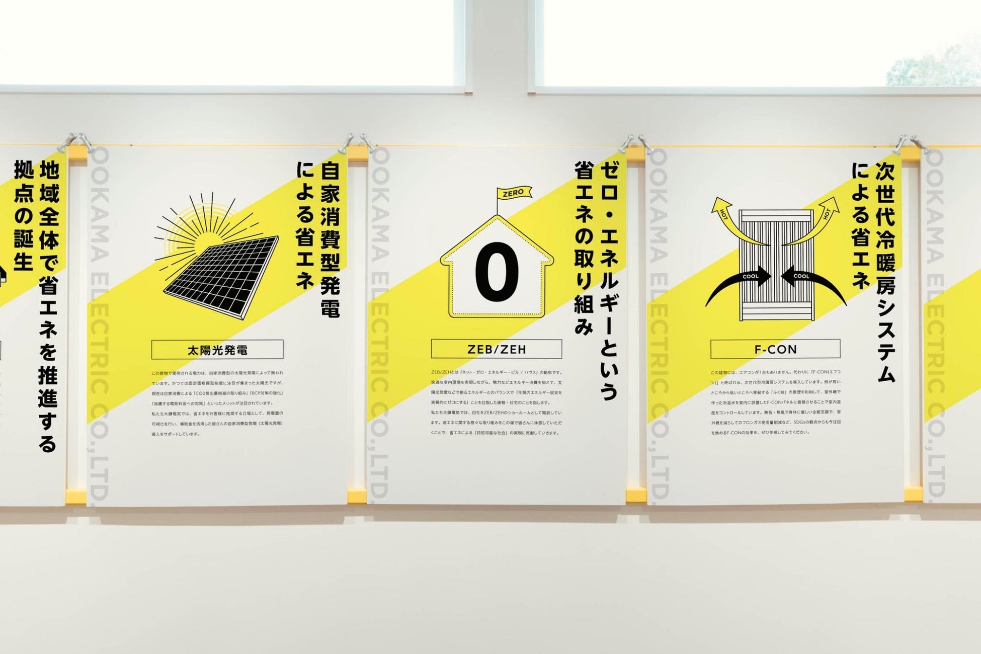 エントランスには太陽光やF-CONをはじめ、業務用空調・冷凍機器の自動制御システム、電力使用量の監視など、ZEB実現やSDGs推進に役立つ私たちの取り組みをパネルで掲示してご紹介しています。
