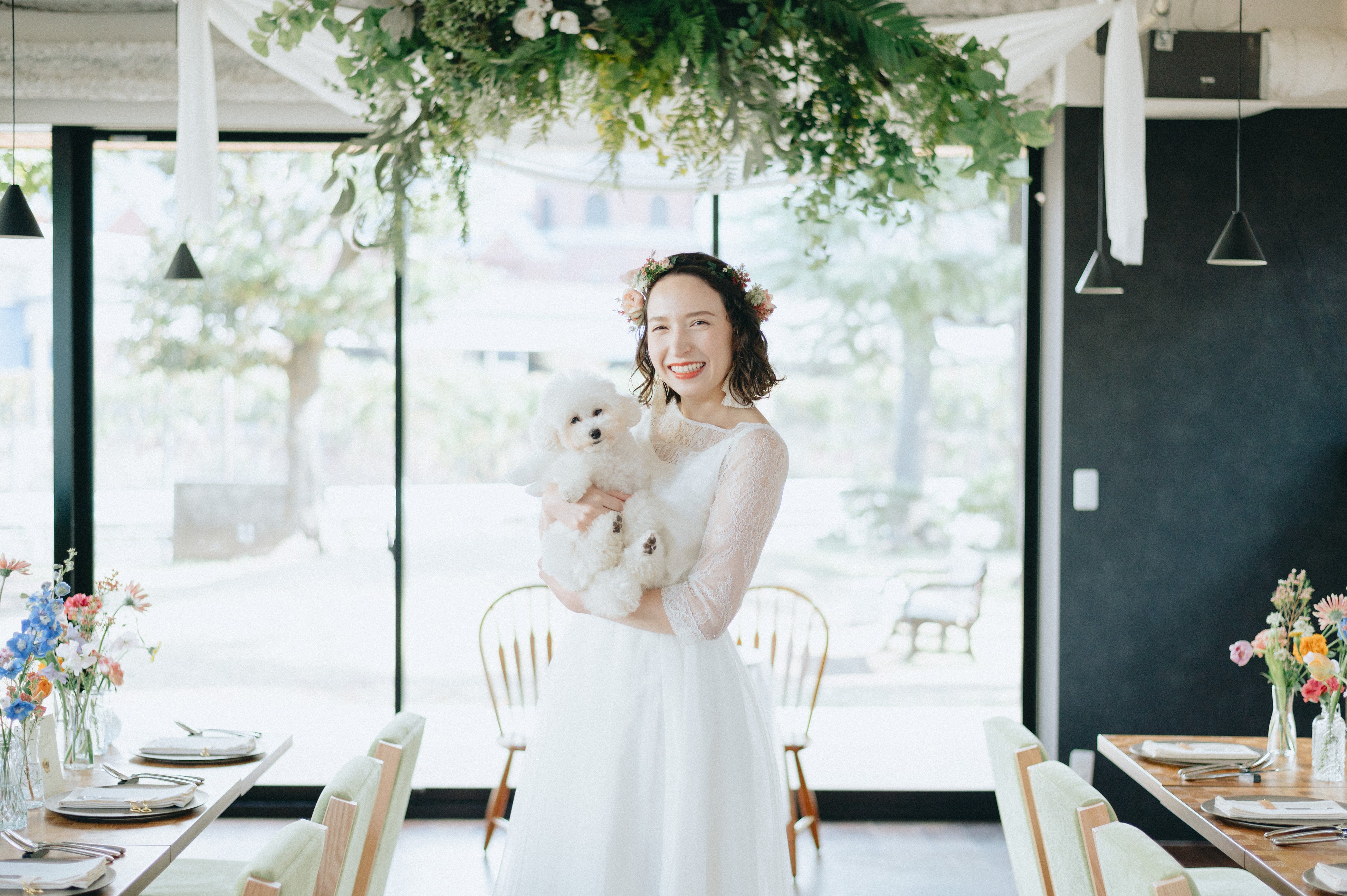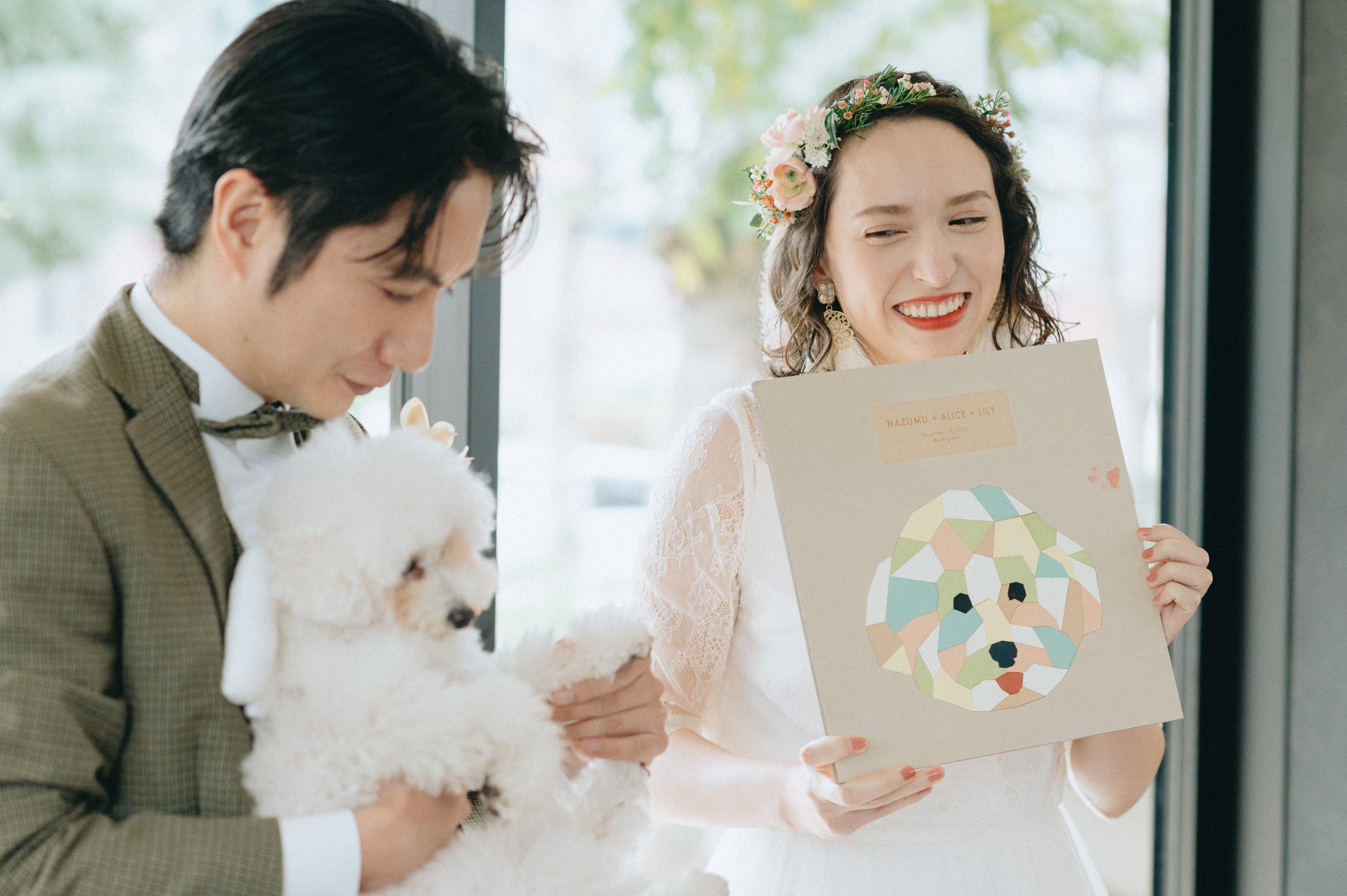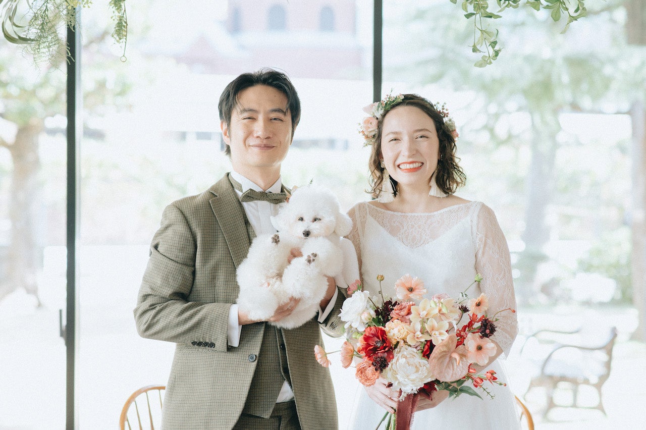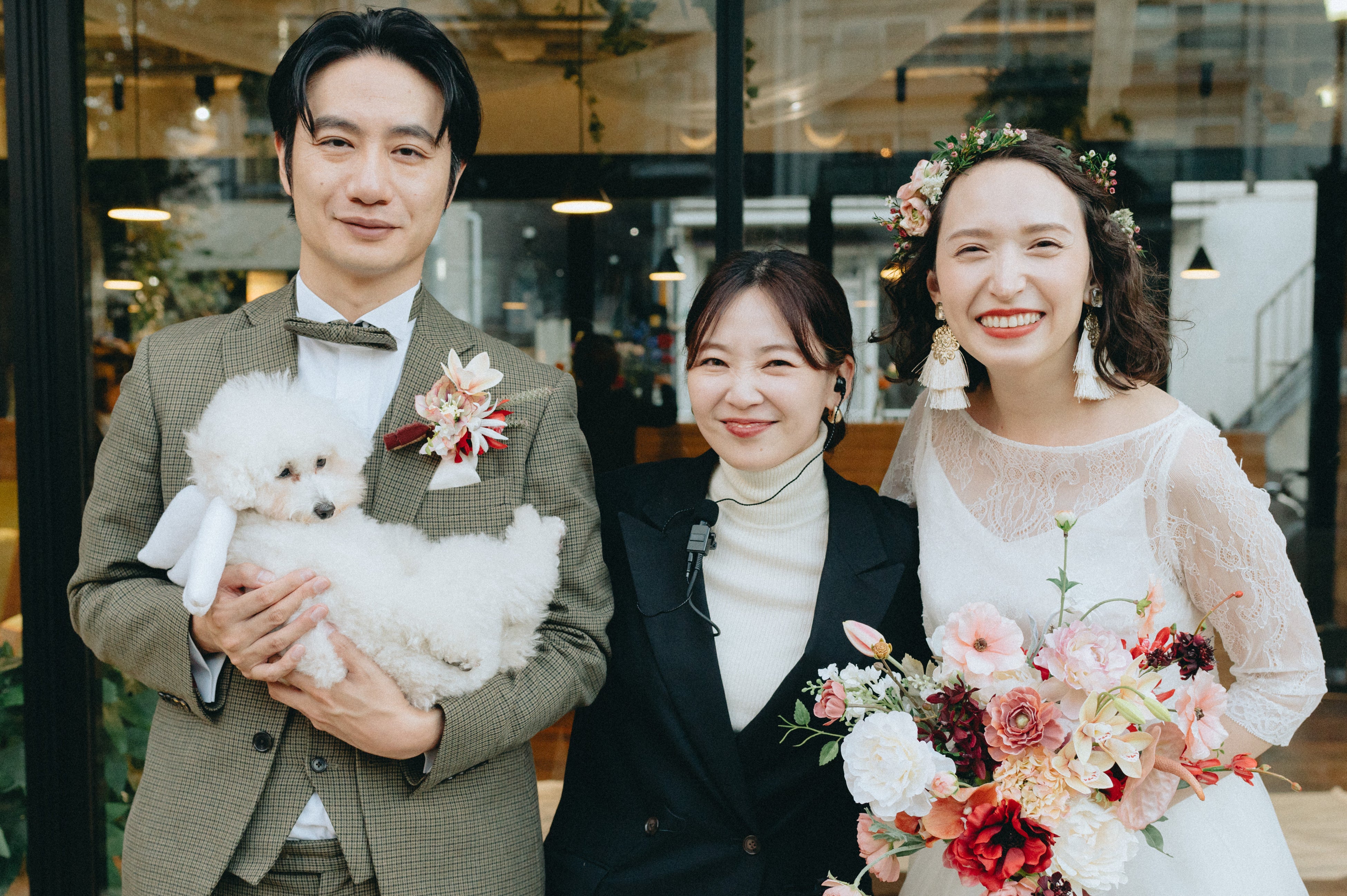 evergreen pet & cafe restaurant EBISU併設されている動物病院で⾏なっている保護⽝の譲渡会で愛⽝リリーと出会ったことをきっかけに、この度、evergreen weddingを利⽤いただきました。