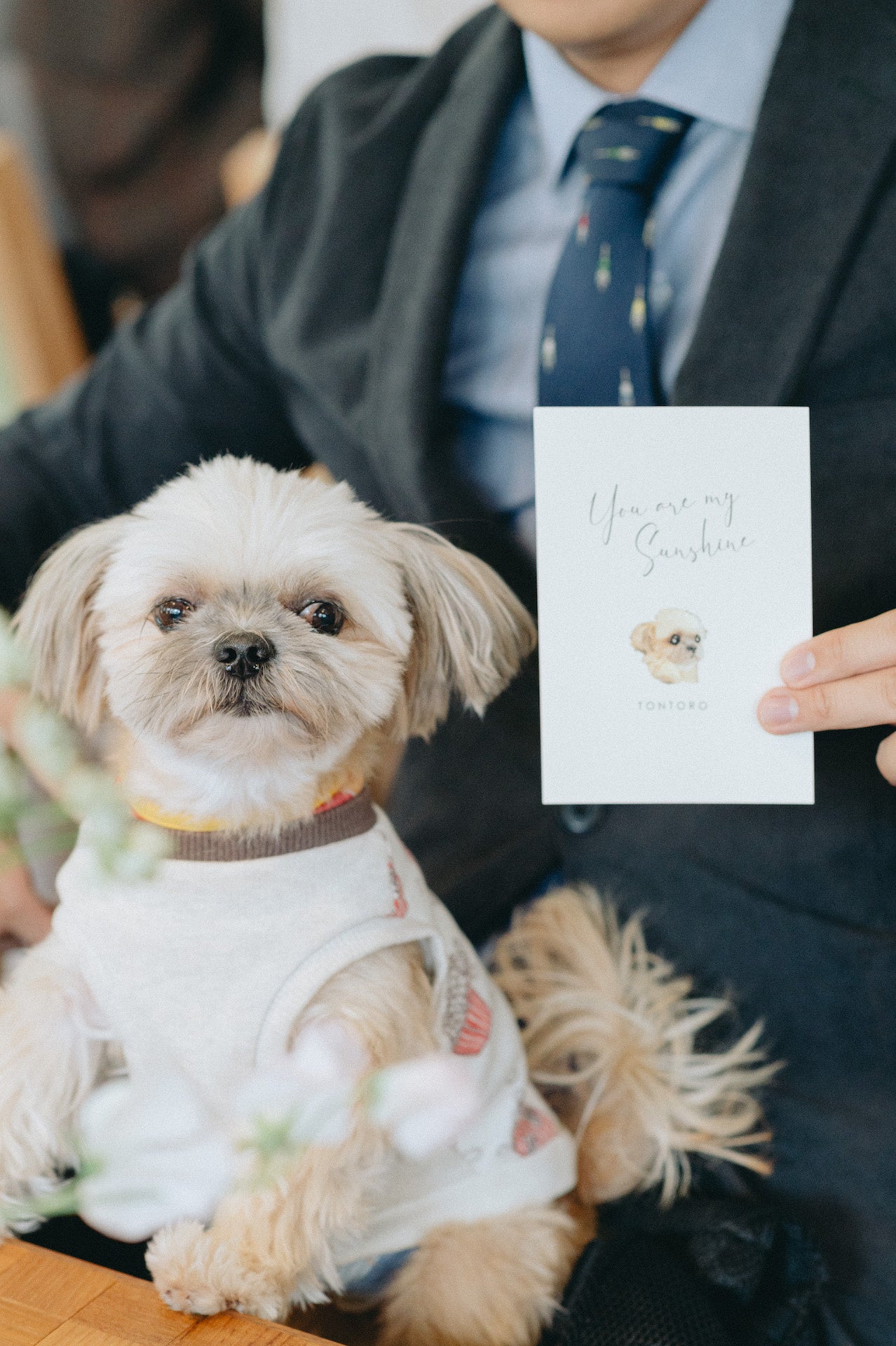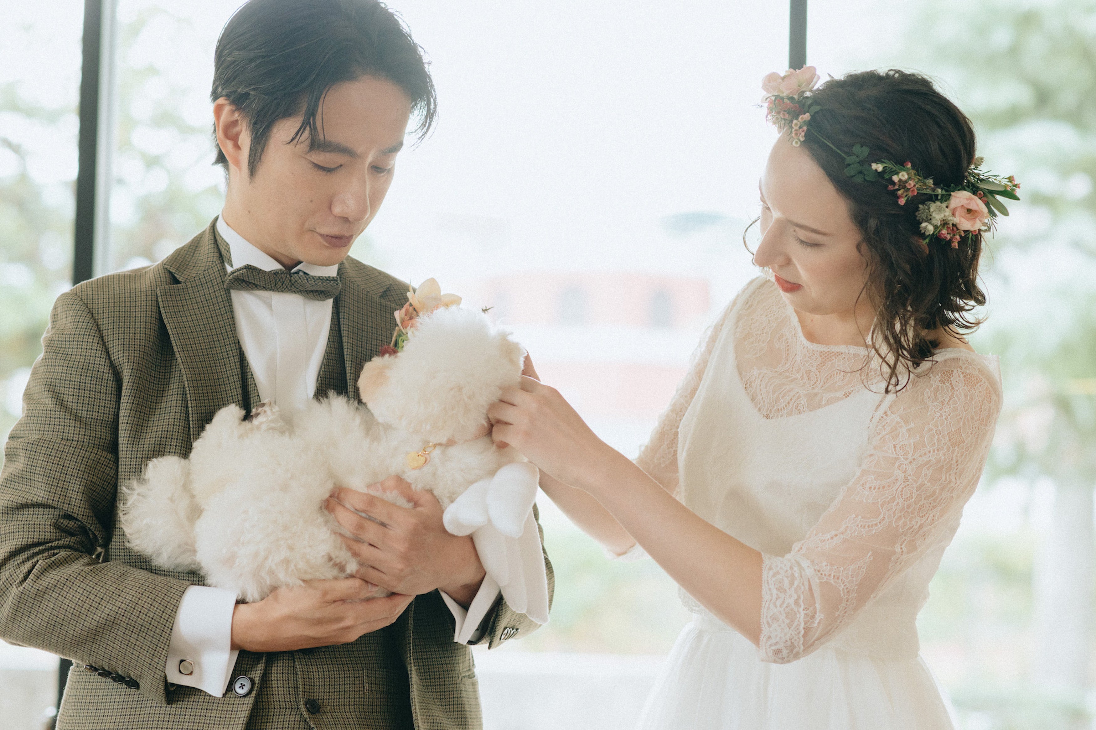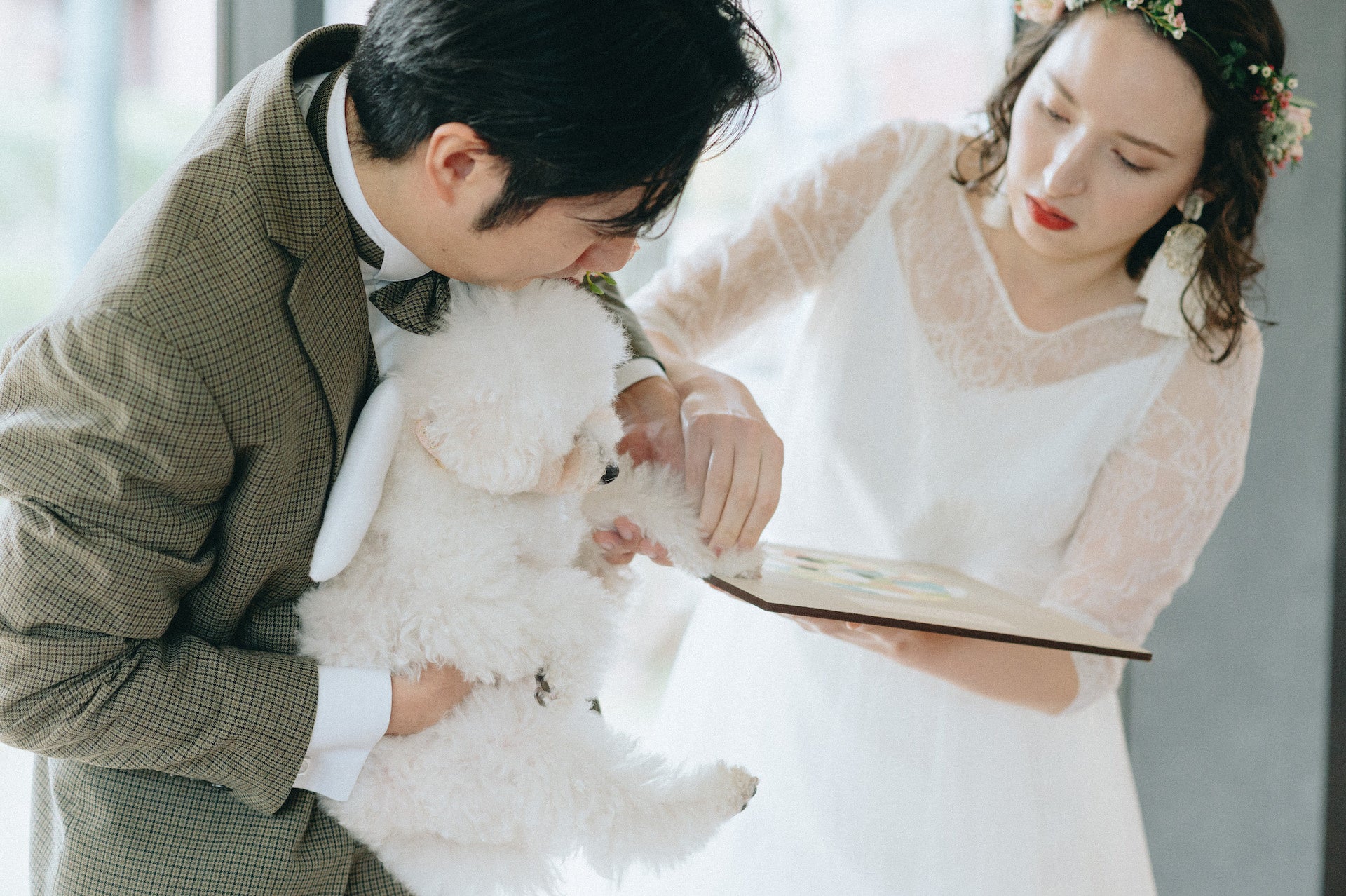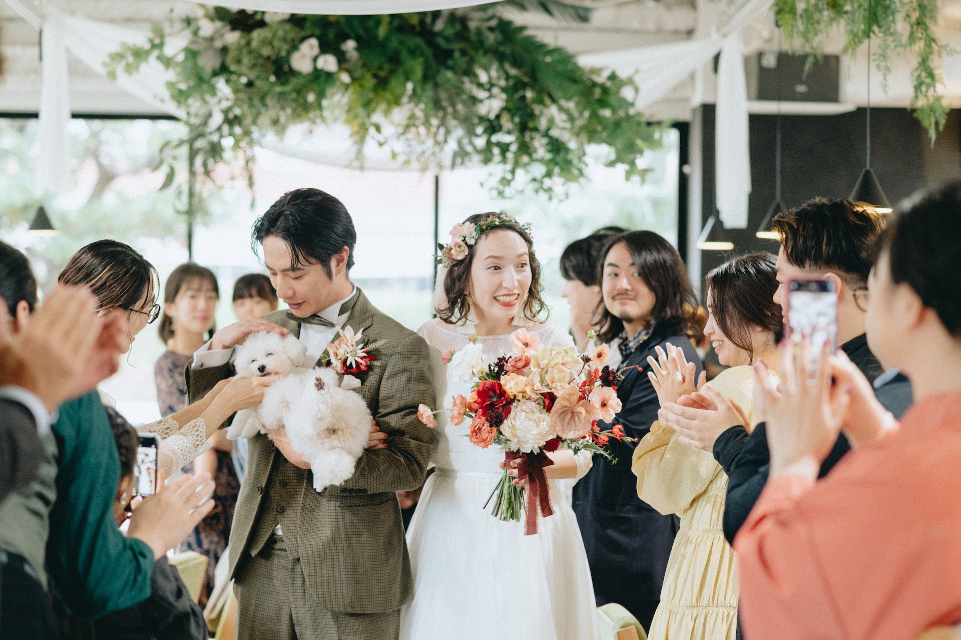 evergreen pet & cafe restaurant EBISU併設されている動物病院で⾏なっている保護⽝の譲渡会で愛⽝リリーと出会ったことをきっかけに、この度、evergreen weddingを利⽤いただきました。