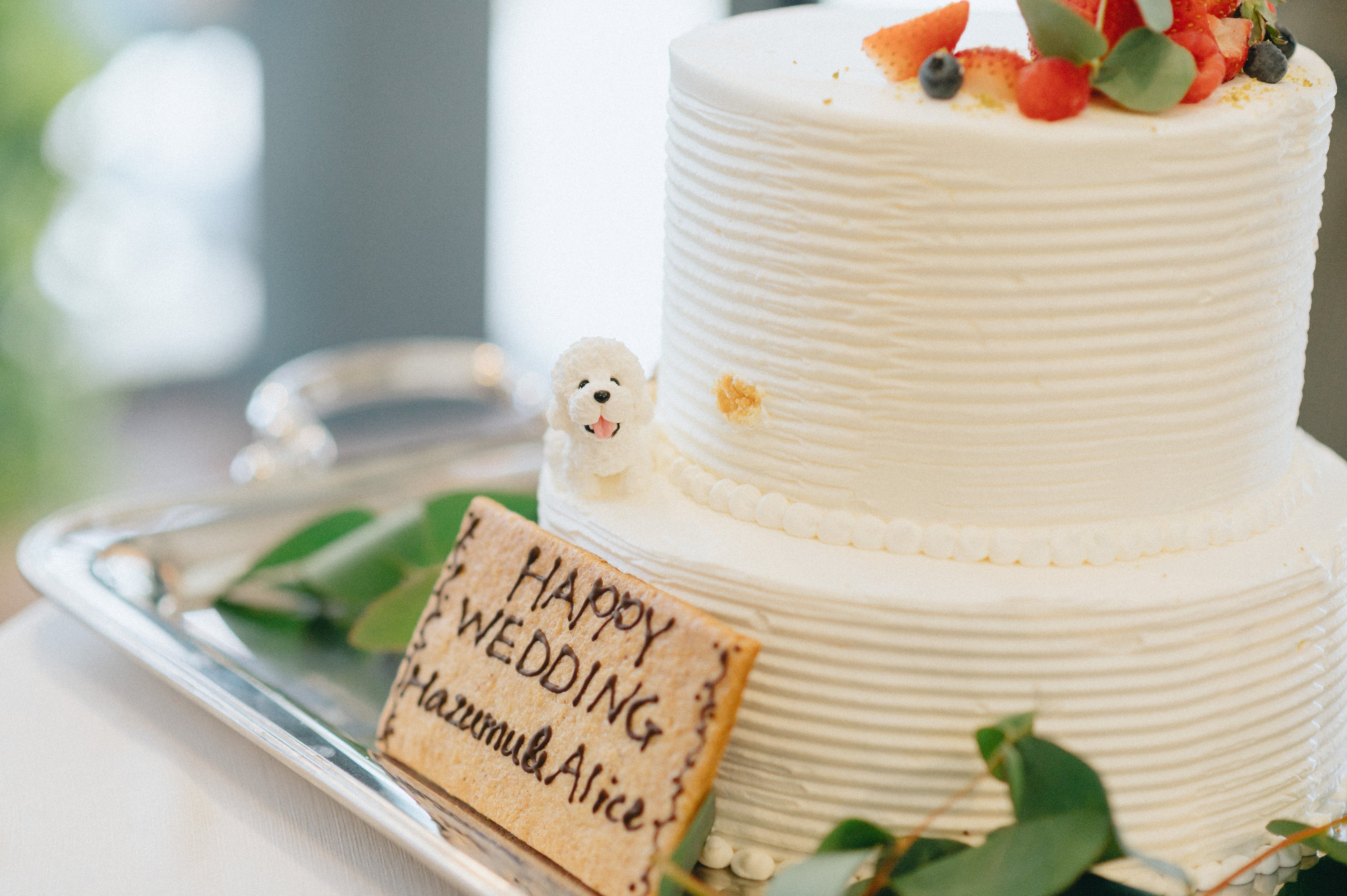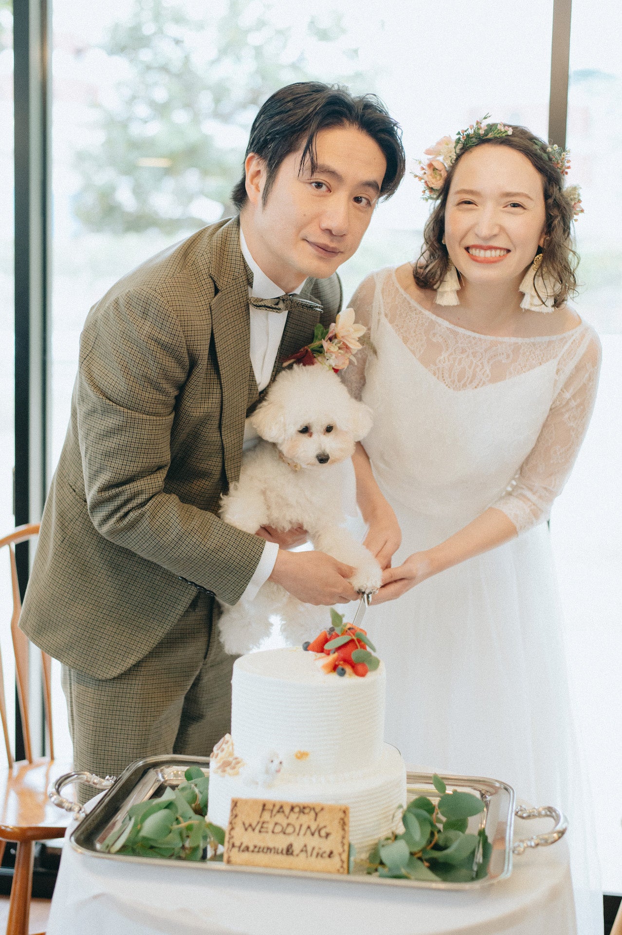 ・愛⽝をモチーフにしたオリジナルウエディングケーキ⼊⼑