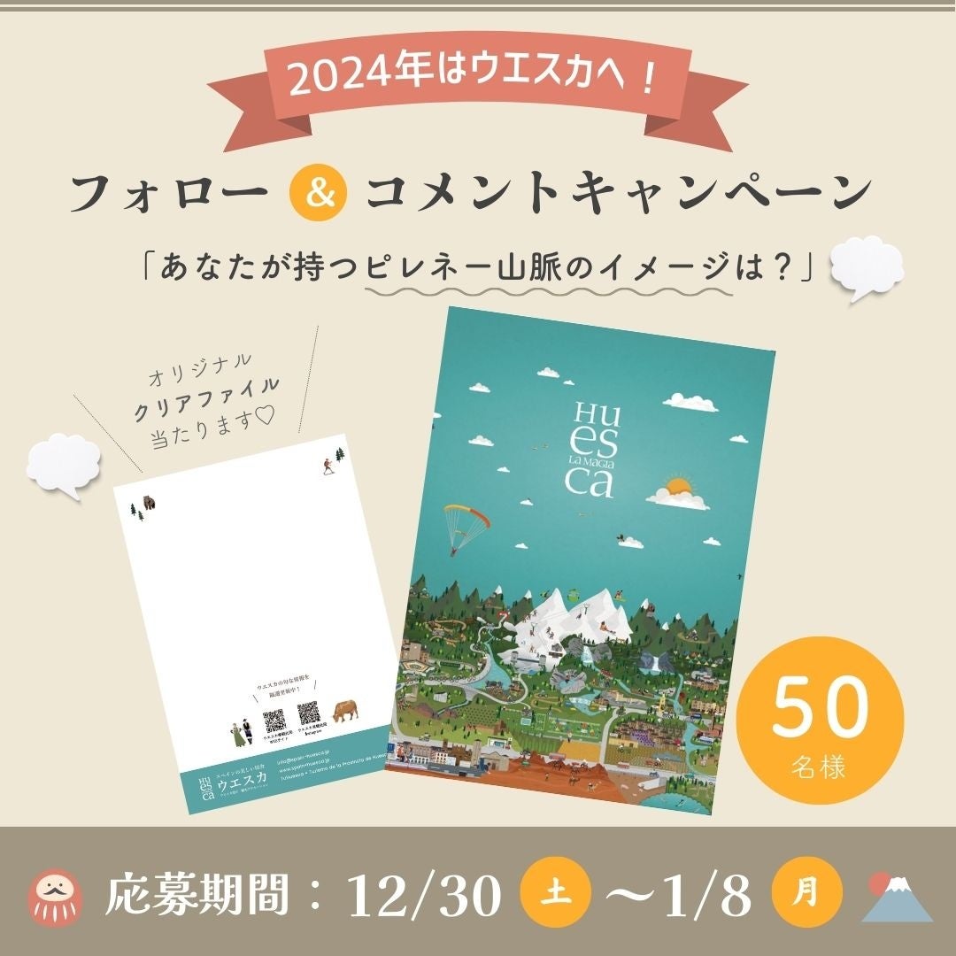 2023年12月30日(土)~2024年1月8日(月)、公式インスタグラム@huescalamagia_jpにて、【スペインの美しい田舎 ウエスカ】の可愛いイラストがプリントされたオリジナル・クリアファイルが当たる、プレゼントキャンペーンを開催中!