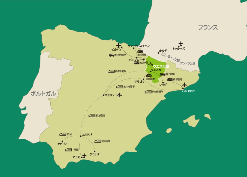 ウエスカはスペイン北東部にあり、マドリッド、バルセロナ、パンプローナ、ビルバオ、サン・セバスチャンなどのスペインの主要都市からアクセスすることができます。