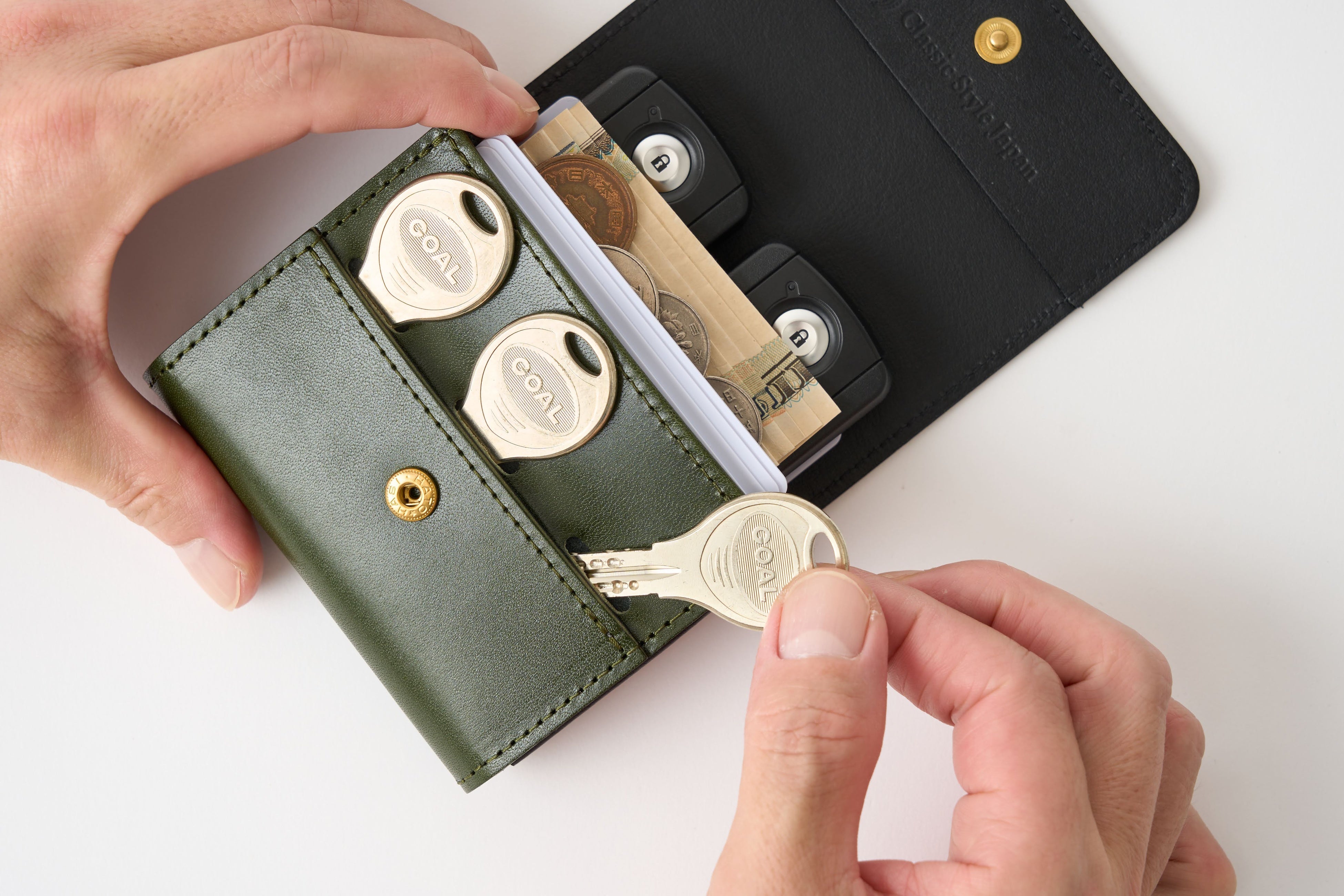 スマートキー2つ・アナログキー3つ・ICカード・その他カード類・お札・コインを全て1つに収納できます。