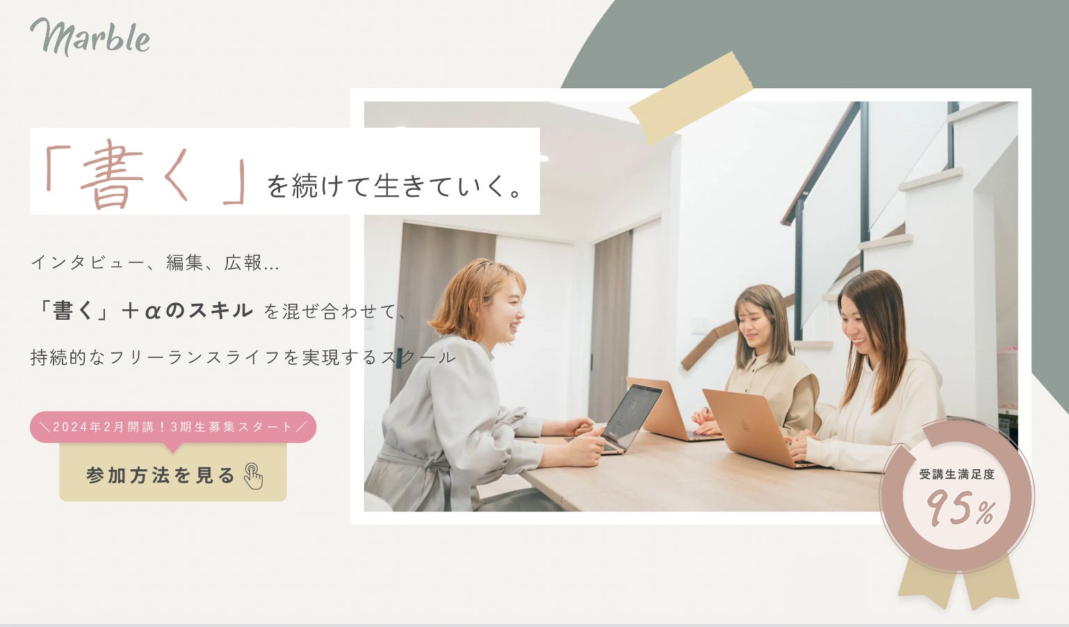 こうしたライターの皆様の課題解決や、リスキリングによるキャリア支援を目指して、「書く」+αのスキルを掛け合わせ、自分らしいフリーランスライフを実現する「Marbleスクール」第3期の開講を決定しました。