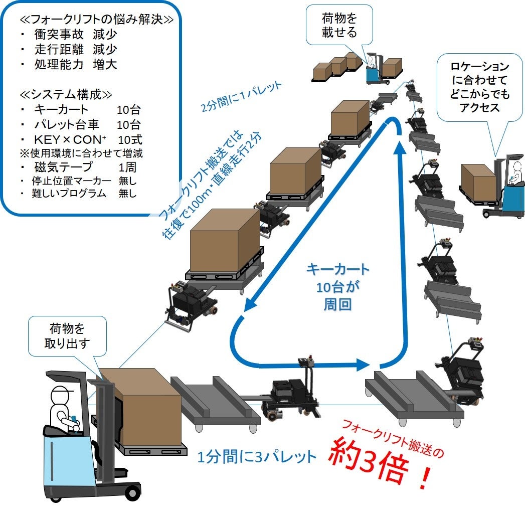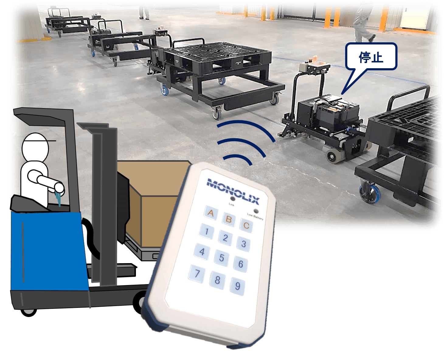フォークリフトに乗ったまま走行中のキーカートを操作できます。