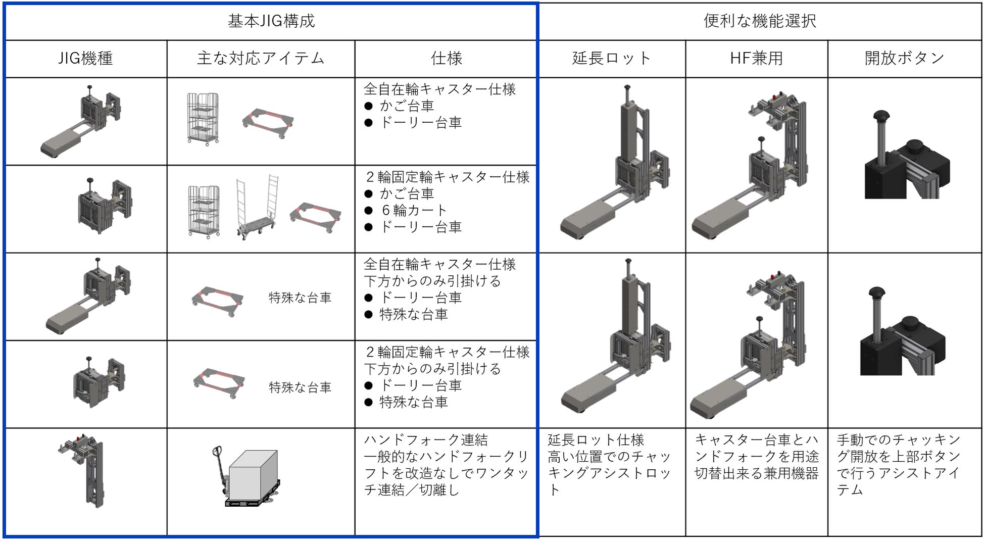 AGV・AMR(無人搬送車、自律走行ロボット)と物流アイテムを連結牽引するための専用冶具です。アタッチメントを変えることで多様なアイテムをワンストップで繋ぎ、牽引から自動切り離しまでを行うことが可能です。ローコストでのAGV導入が可能となり、運用の幅が広がります。