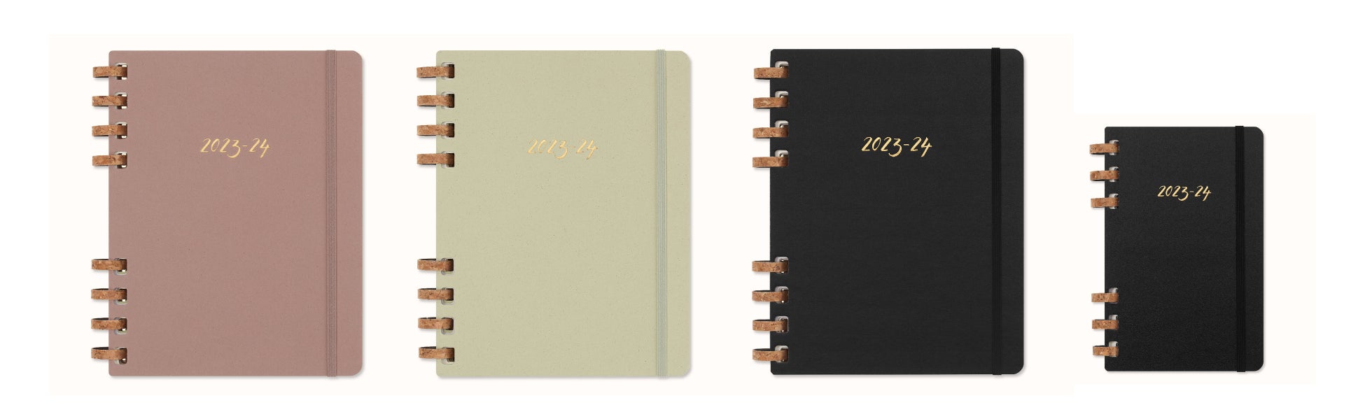 スパイラルアカデミックダイアリーは学生向けに設計されたダイアリーです。学業とプライベート両方の目標と具体的な行動を計画するためのセクションがあり、学生生活の整理整頓をサポートする時間割、成績表、テストやレポートなどのプロジェクト管理も含まれております。また、アーモンドやキウイなどの廃材を15%リサイクルして作られた表紙を使用していることも特徴です。