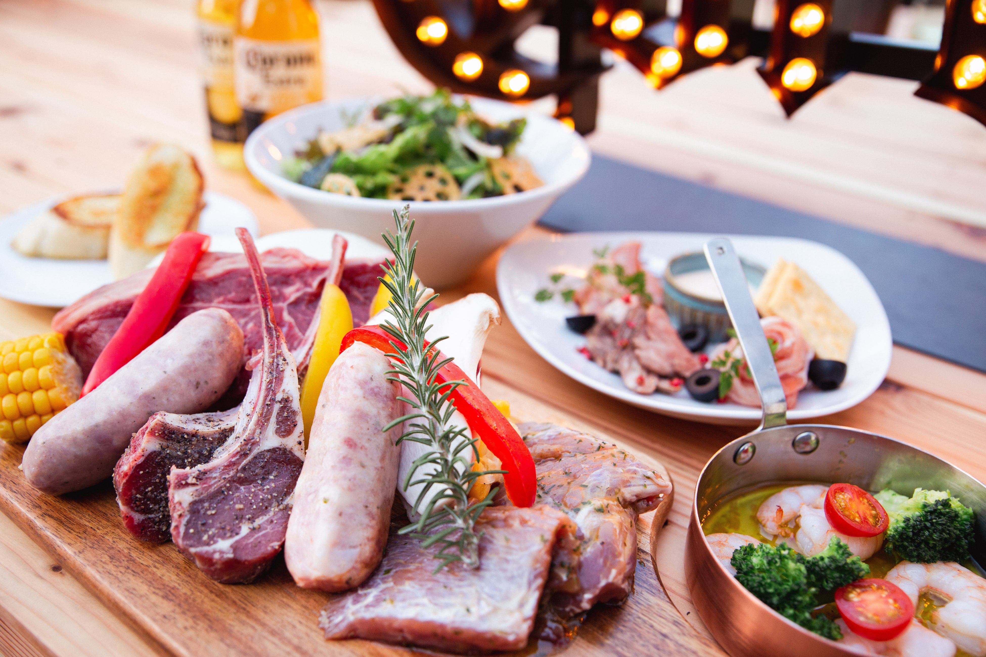 牛・豚・鶏・ラム肉をはじめマグロの頬肉や牡蠣、海老などのシーフードをご用意したBBQを手ぶらでご堪能いただけ、フリーフロー(飲み放題)でビアガーデンをご利用いただけるプランをご用意。 フリーフロードリンクにはCorona Extra(コロナ瓶ビール)やKIRIN一番搾り生ビール、スミノフカクテルやモヒート等もご用意しております。