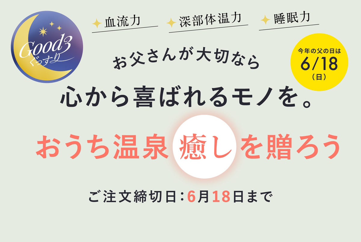 長湯ホットタブによる”おうち温泉”では、弊社がかかげる”お休み前の入浴でGood3(ぐっすりー)”