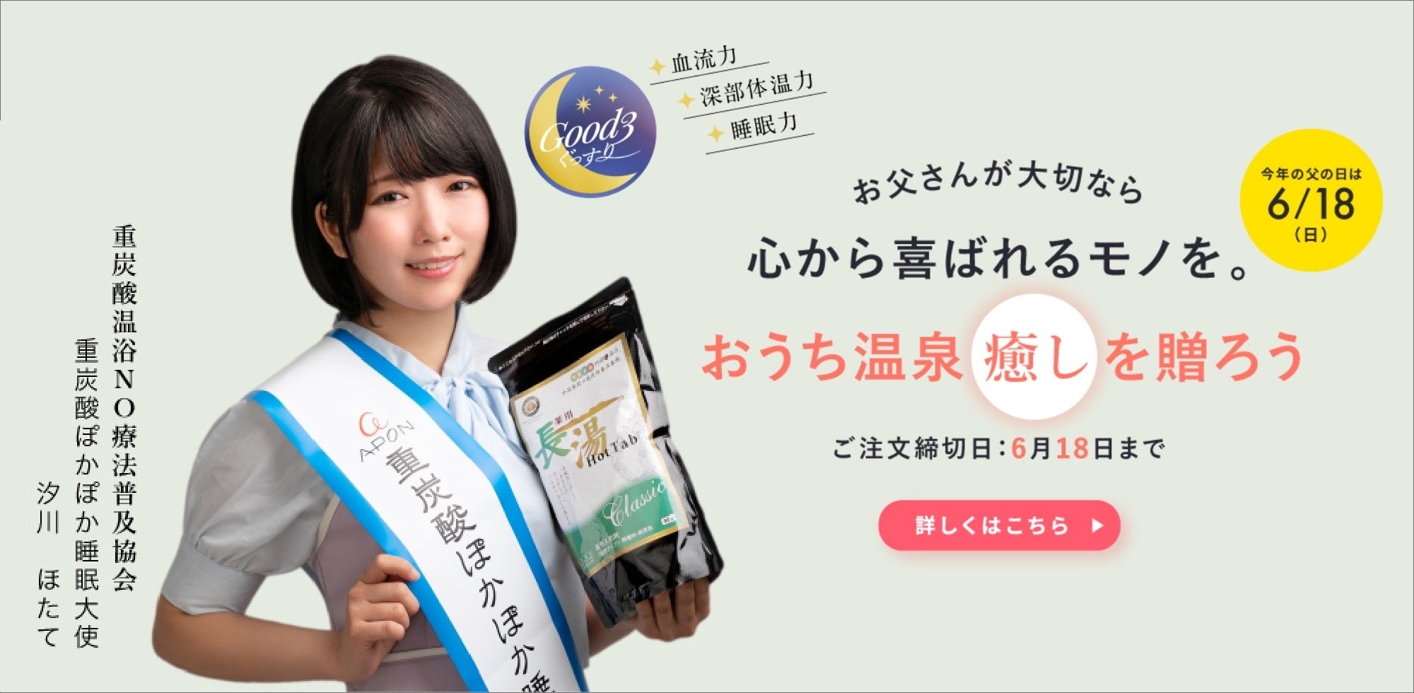 この度、”純正重炭酸入浴剤”の製造・販売を手掛ける株式会社長湯ホットタブ(本社:大分県竹田市、代表取締役:小星重治)は、「父の日ギフトキャンペーン」を実施致します。