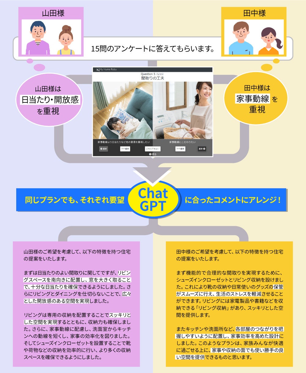 「マイホームロボ」は施主にアンケートに答えてもらうことで、その答えに沿った適切なプラン候補をAIが選び出します。営業パーソンはそのプランの中から更に絞り込んで最終の提案書を作成しますが、今回の「ChatGPT」との連携により、その提案書に施主のアンケート回答に応じた提案コメントを自動掲載します。
