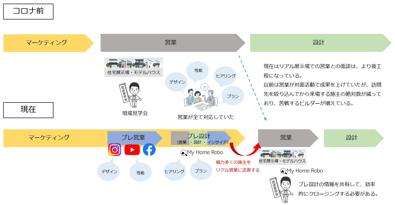 このたびの新型コロナウイルスの影響により、住宅事業者におけるデジタル化の流れが加速しました。今ではリアルな対面営業の前に、YouTubeやInstagramによる、いわゆるプレ営業と言われるWeb上での事前案内が普通となり、そこからリアル展示場へと誘導する手法が一般的になりました。また、昨今の施主はインターネットにより効率的に情報収集ができ、訪問する住宅事業者を事前に絞り込むため、これまで営業パーソンによる対面活動で成果を上げてきた住宅事業者が集客に苦戦する状況も増えてきています。
