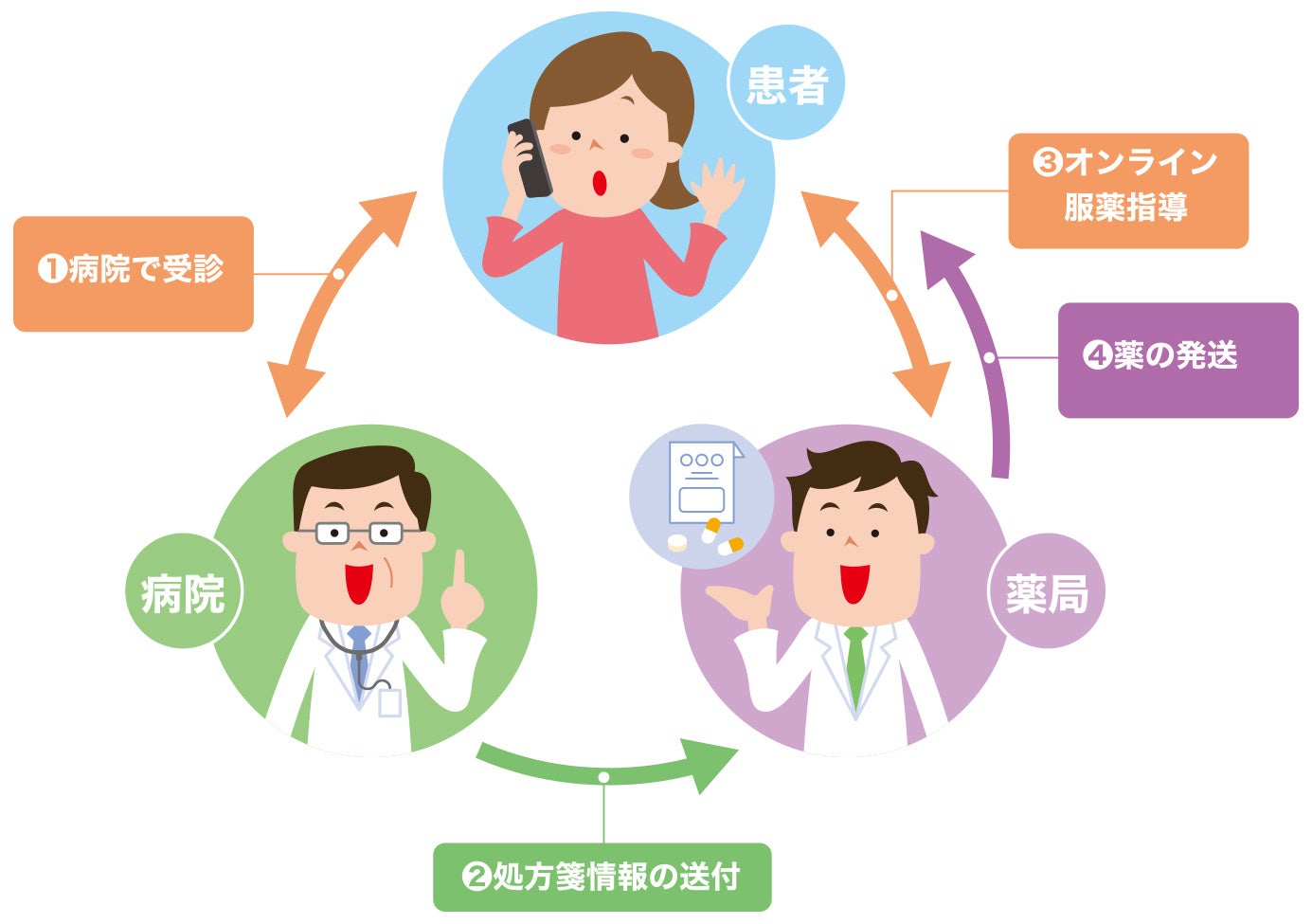 病院で診察を受け、薬の処方箋を発行してもらったら、通常はそれを薬局に持っていき、薬の調剤と服薬指導をしてもらいます。「オンライン服薬指導」は、直接薬局に行かなくてもインターネットで繋ぎ、オンラインで服薬指導をしてもらえるという仕組みです。