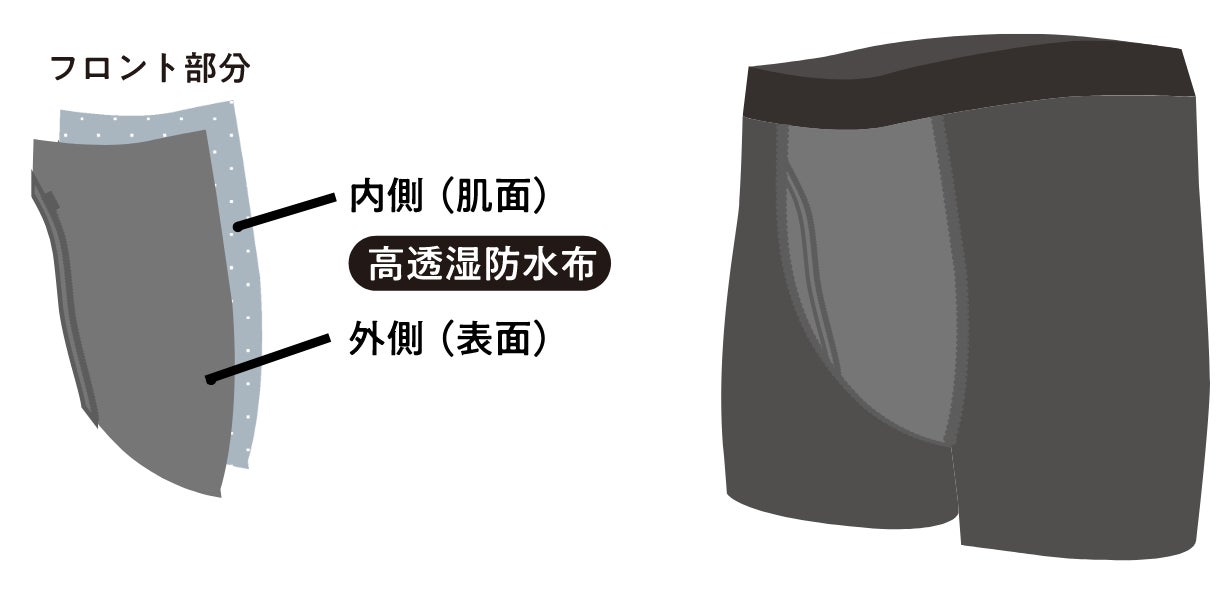 フロント部分に「高透湿防水布」を追加することで、ちょい漏れ尿を表面に染み出させない役割をプラスできます。