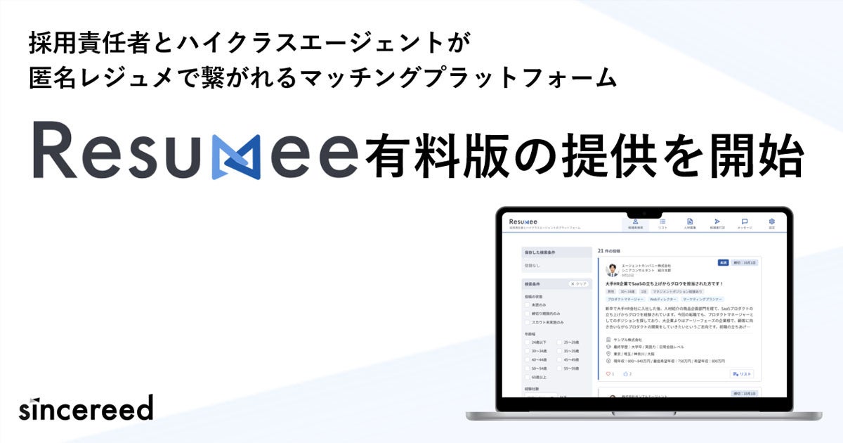 sincereed社、採用企業と転職エージェントのマッチングプラットフォーム「Resumee(レジュミー)」の正式提供を開始