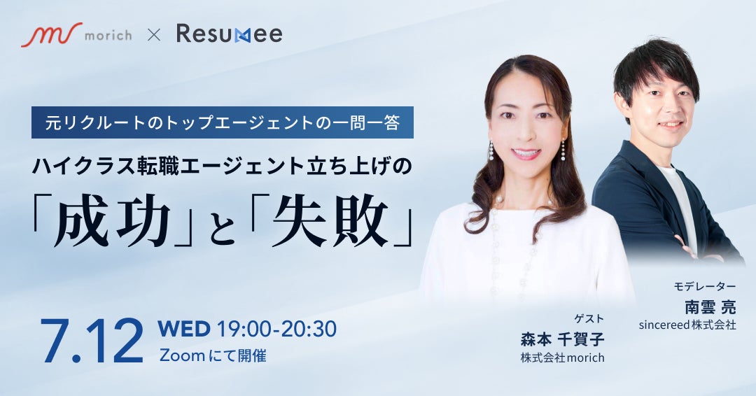「Resumee」の有料版提供開始を記念して7月12日(水)に株式会社morich 森本千賀子氏をゲストに迎え、転職エージェント様向けセミナーを開催いたします。ご興味のある方は是非ご参加いただけますと幸いです。