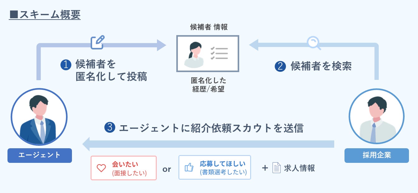 1.エージェントの方がご支援している候補者を匿名レジュメとしてResumeeに登録でき、採用企業はその匿名レジュメを確認後、エージェントに「紹介依頼スカウト」を送ることができます。