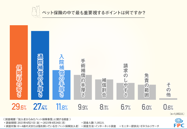ペット保険の中で最も重要視するポイントを聞いたところ、『保険料の安さ(29.6%)』『通院補償の手厚さ(27.4%)』『入院補償の手厚さ(11.8%)』という結果に