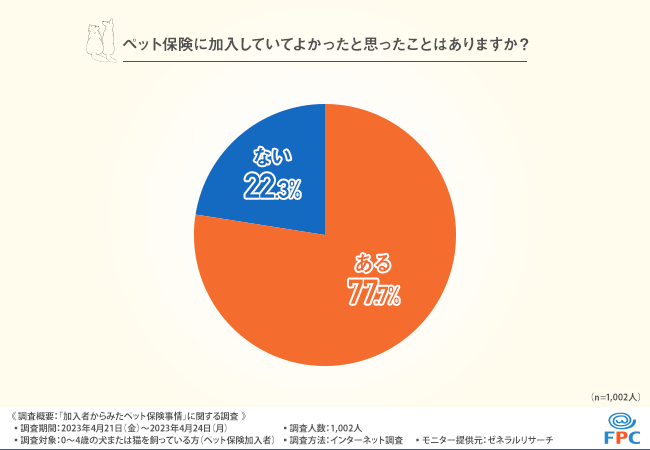そこで今回、ペット保険を扱う株式会社FPC(https://www.fpc-pet.co.jp/)は、0~4歳の犬または猫を飼っている方(ペット保険加入者)を対象に、「加入者からみたペット保険事情」に関する調査を実施しました。