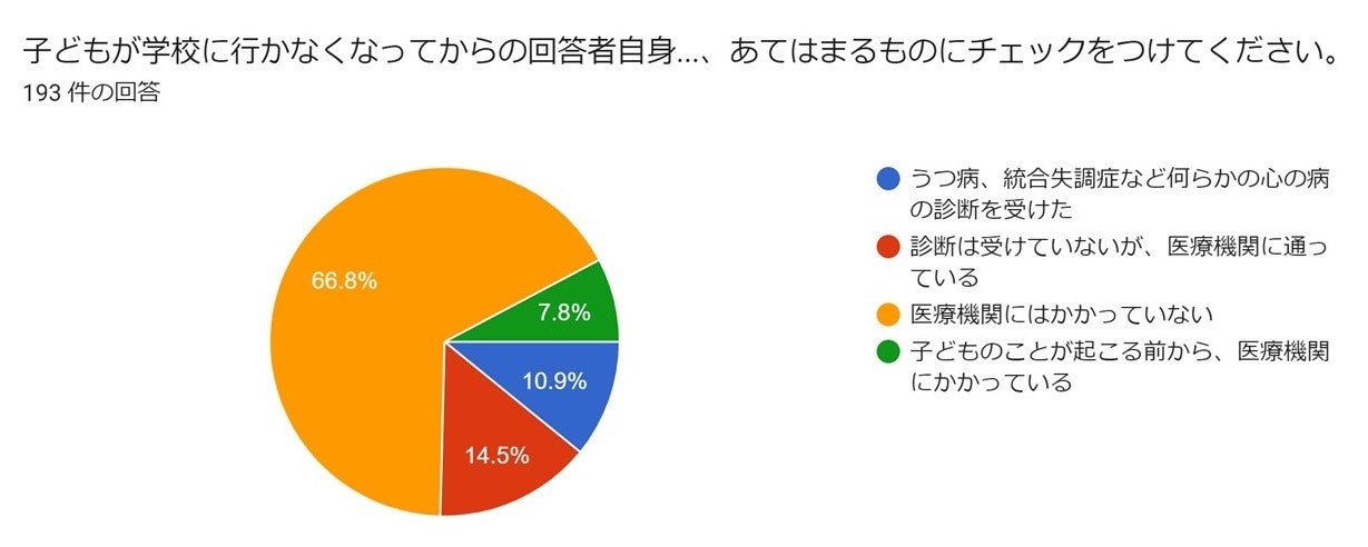 2021年度の不登校の小中学生は24万人を越え、9年連続増加しています。不登校と言うと、子どもにフォーカスされがちですが、実は保護者の負担もとても大きいです。事実、私たちの運営する保護者向けの無料LINE相談窓口には、「子どもの不登校から、母親の私がうつ病と診断された」「子どもを愛せなくなり、そんな自分も許せず、死にたいとすら思っている」といった声も届いています。独自にアンケートをとると、3人に1人が精神的に不安定な状態になっていることがわかりました。