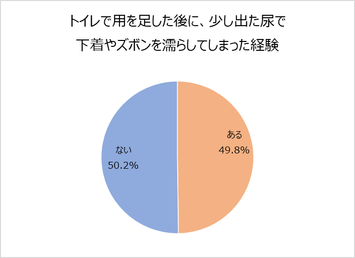 用を足した後に、少し出た尿で下着やズボンを濡らしてしまった経験について質問。結果は、約半数が「ある(49.8%)」と回答しました。年代が高くなるごとに経験者が増えているものの、20代でも3人に1人以上(34.4%)が経験していました。男性にとっては日常的に起こっているトラブルのひとつと捉えることができそうです。