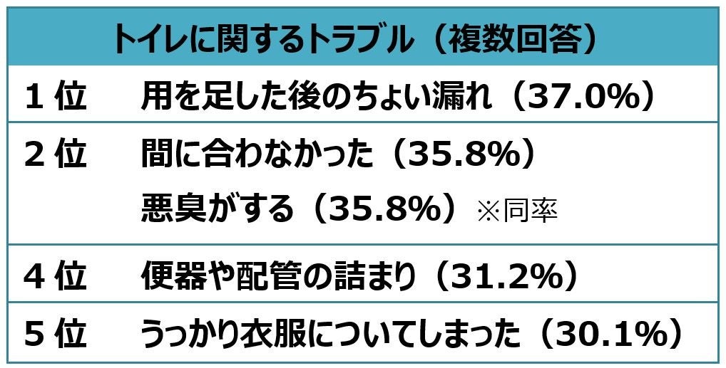 2.トイレに関するトラブル1位「ちょい漏れ」 2位「間に合わなかった」「悪臭」