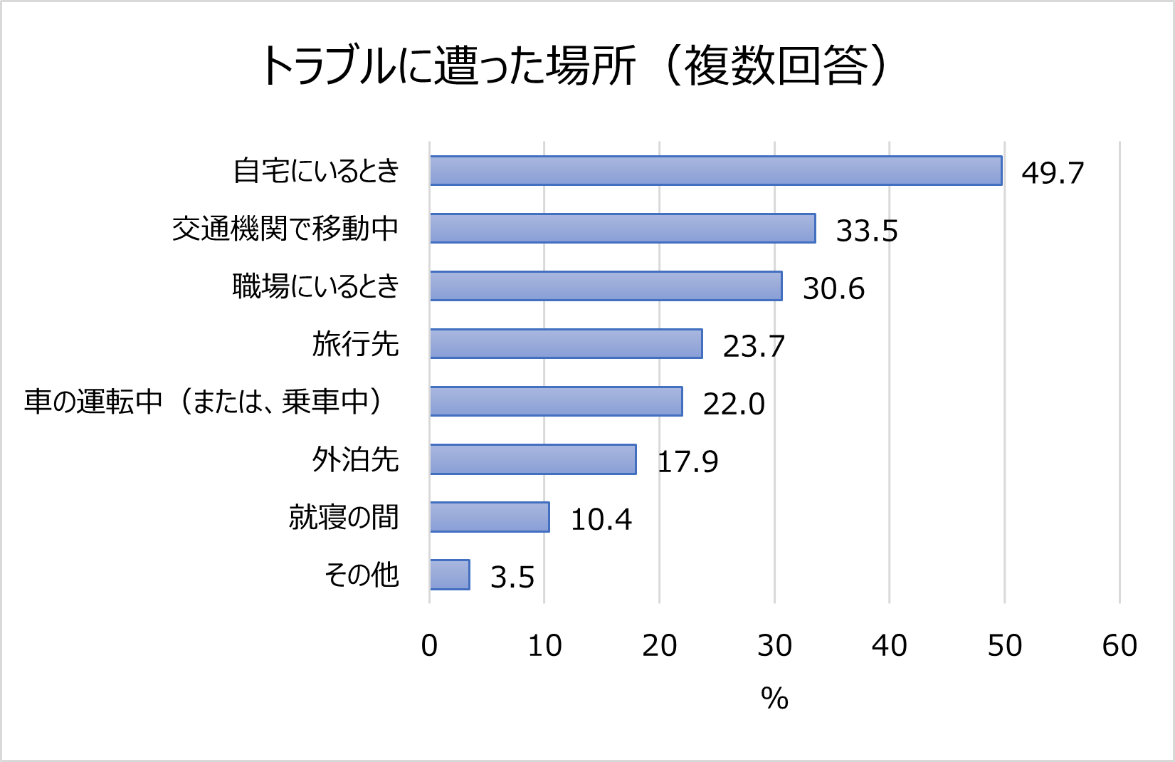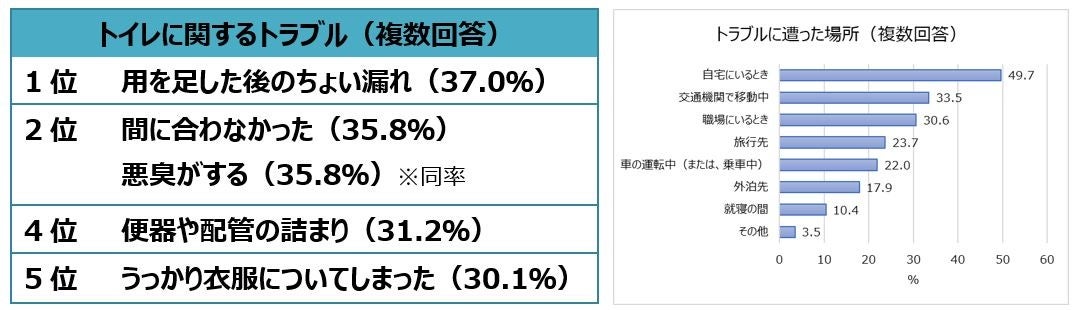 続いて、トイレトラブルの経験者に対し、どのようなものだったのか質問。1位は「用を足した後のちょい漏れ(37.0%)」2位は「間に合わなかった(35.8%)」「悪臭がする(35.8%)」という結果でした。トイレそのもののほか、自身の体調や不注意に関する項目に回答が集まりました。また、トラブルに遭った場所については、「自宅(49.7%)」が最も多く、自由にトイレに行くことが難しい「交通機関で移動中(33.5%)」が2位でした。