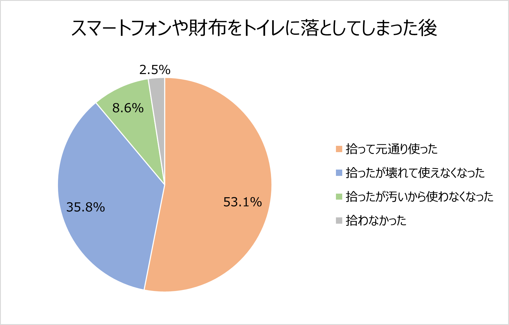 常に持ち歩いていることが多い財布やスマホ。トイレまで持って行って、落としてしまった経験について質問しました。経験があったのは約6人に1人の16.2%。その後、どうしたのかについては、「拾って元通り使った(53.1%)」が過半数という結果でした。拾ったものの使えなかった・使わなかったという回答のほか、そもそも「拾わなかった(2.5%)」という人も一定数いることが分かりました。