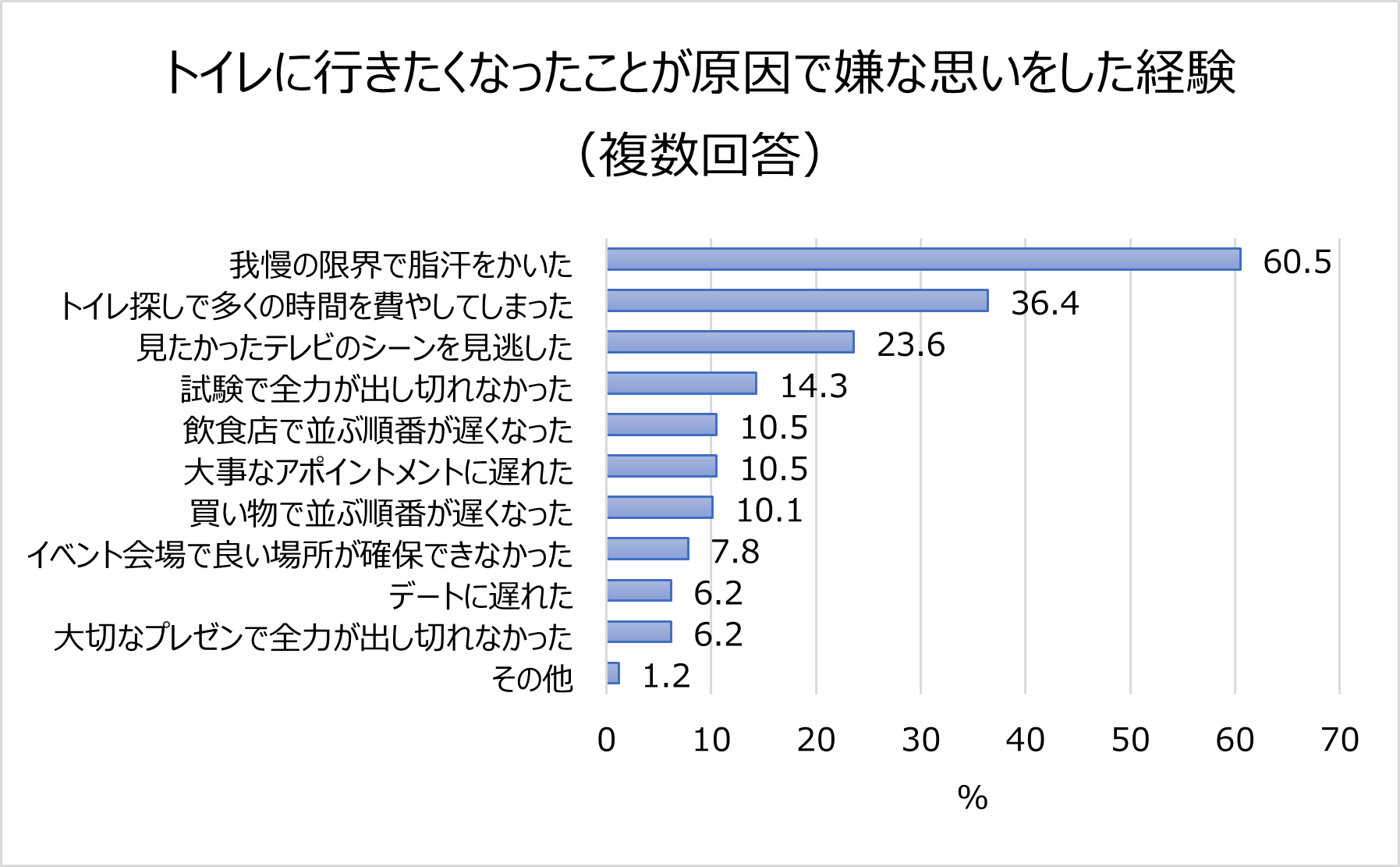 トイレによる嫌な経験「我慢の限界で脂汗」「トイレ探しに時間がかかった」「テレビのシーンを見逃した」