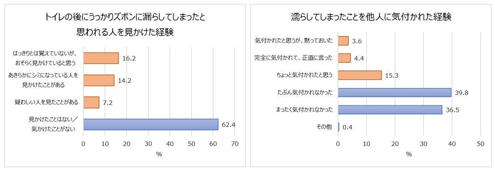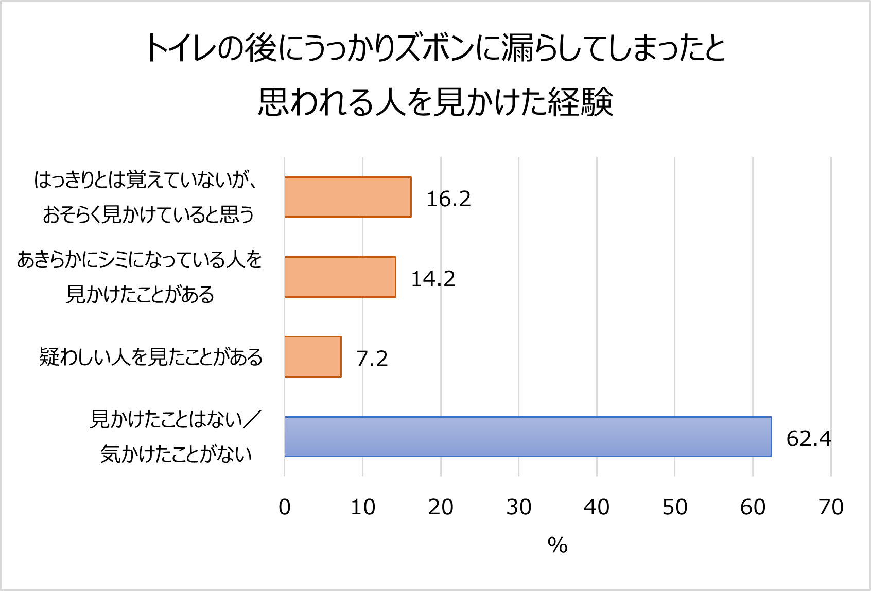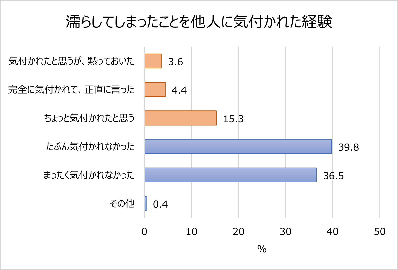 トイレ後にズボンを濡らしてしまった人を見かけたことがあるかという質問では、約4割の人が何かしらに気が付いていました。逆に自身について、他の人に気が付かれたかどうかを聞いたところ、「ちょっと気付かれたと思う(15.3%)」「完全に気付かれて、正直に言った(4.4%)」「気付かれたと思うが、黙っておいた(3.6%)」を合わせて、約2割の人は気付かれた可能性があると回答。自身についてよりも、他人がつけてしまったシミについて見かけたことがある人の割合が高いことから、自分が思っている以上にシミをつけてしまうとバレる可能性が高いことが考えられます。